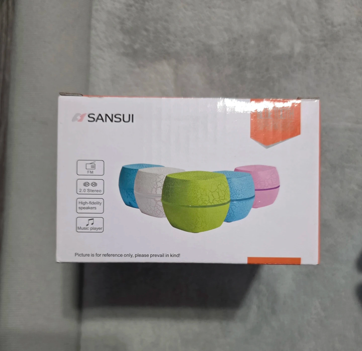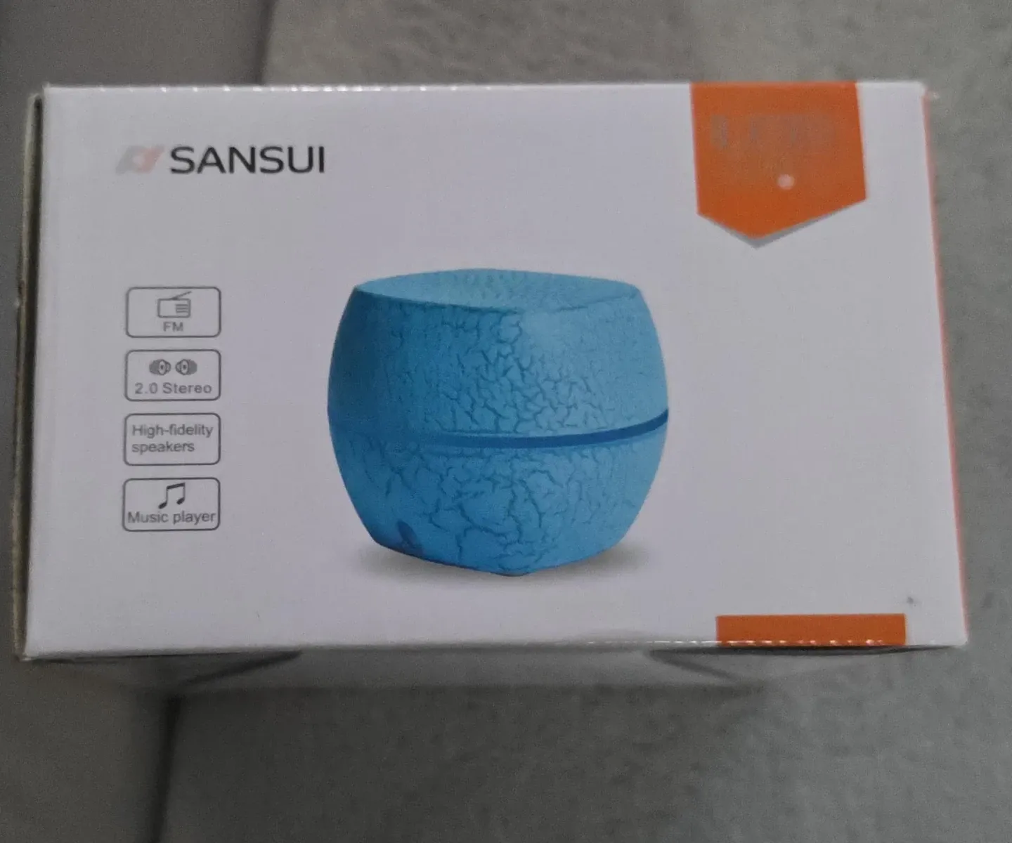 This is a Sansui A36 Bluetooth speaker in blue. It's a portable multimedia player with 3W speaker output. Supports FM, AUX IN, TF Card/USB playback, and Bluetooth connectivity. Brand new in box.