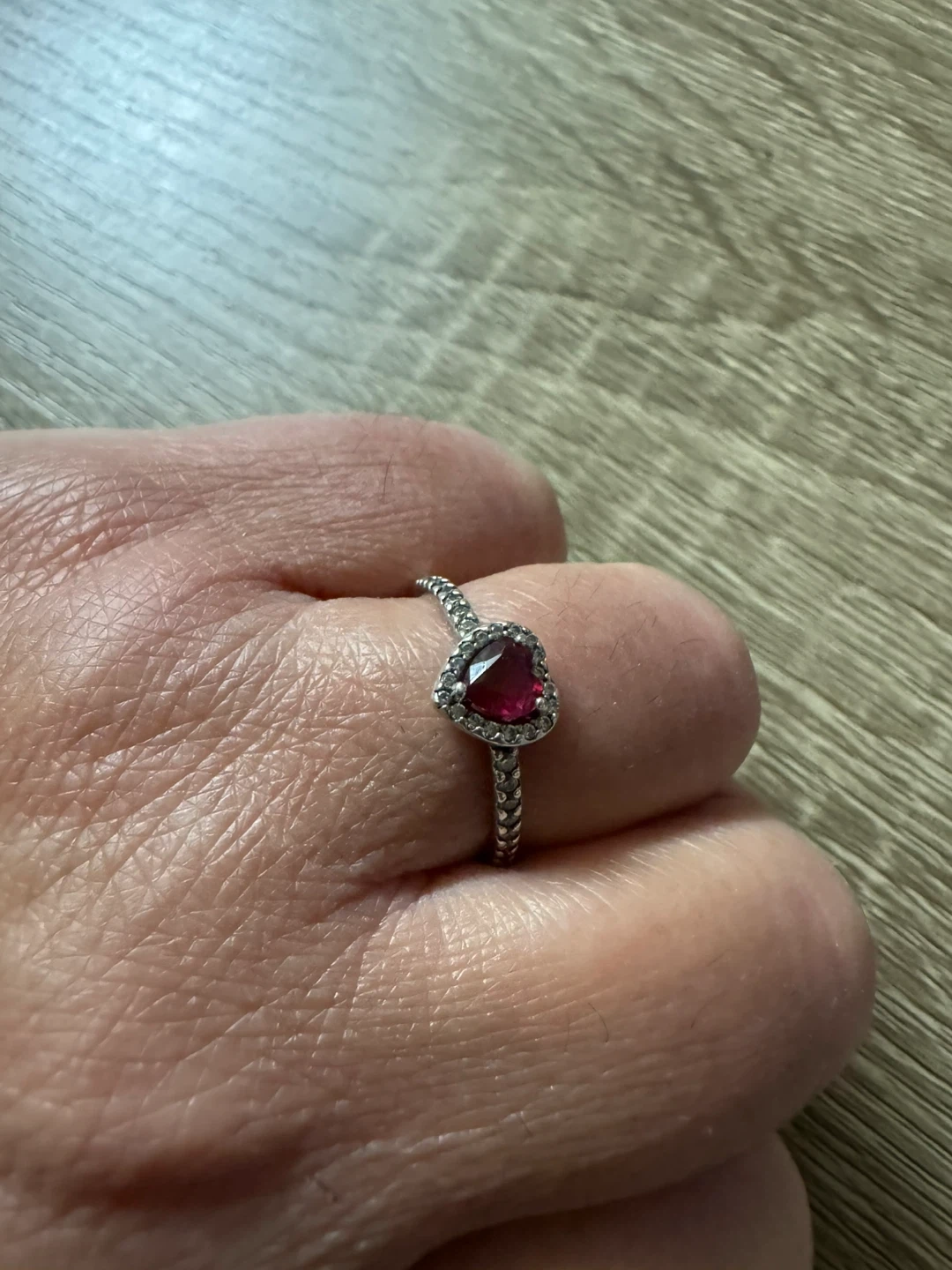 This Pandora ring is crafted from sterling silver with a heart-shaped ruby-red stone. It's accented with small clear stones around the main gem and has a braided band. Features "S925 ALE 60" inscribed on the inside.