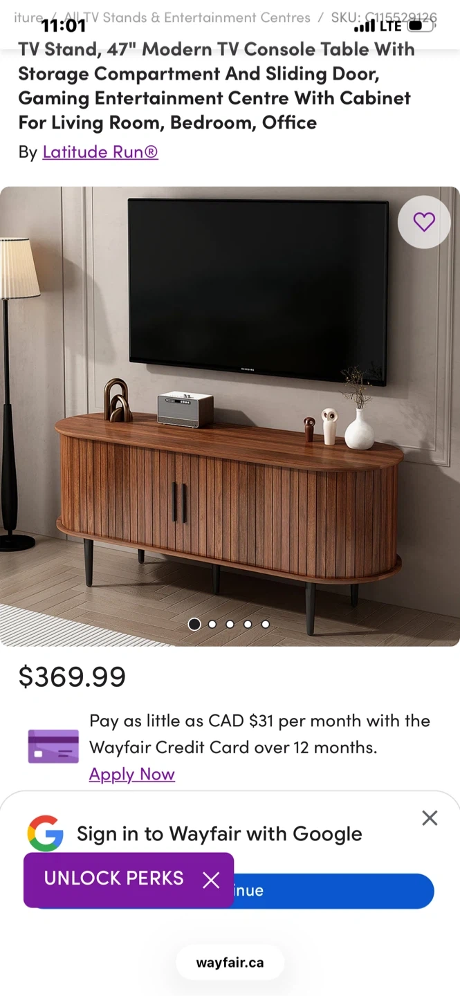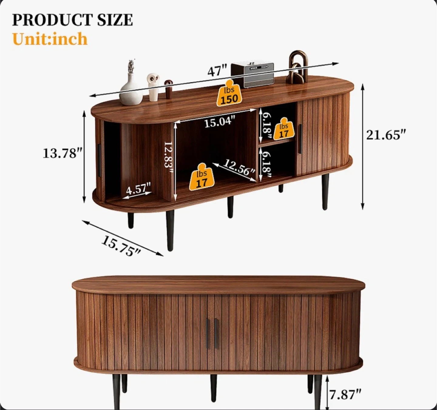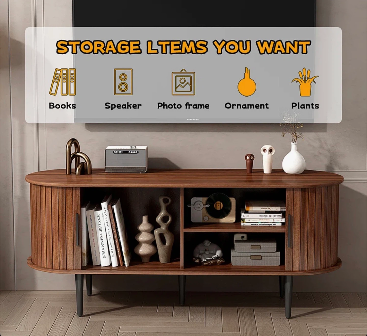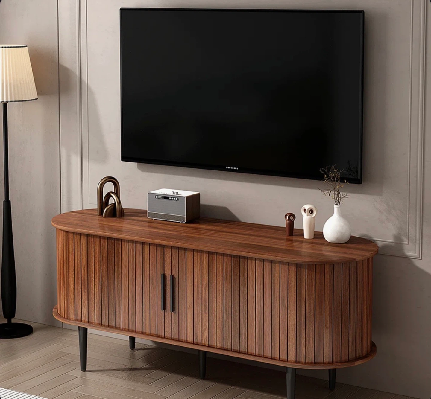 This oval-shaped TV stand is crafted from rich walnut wood with a slatted door design. It features ample storage space for media components and decor. Supports TVs up to 47 inches and has a weight capacity of 150 lbs.