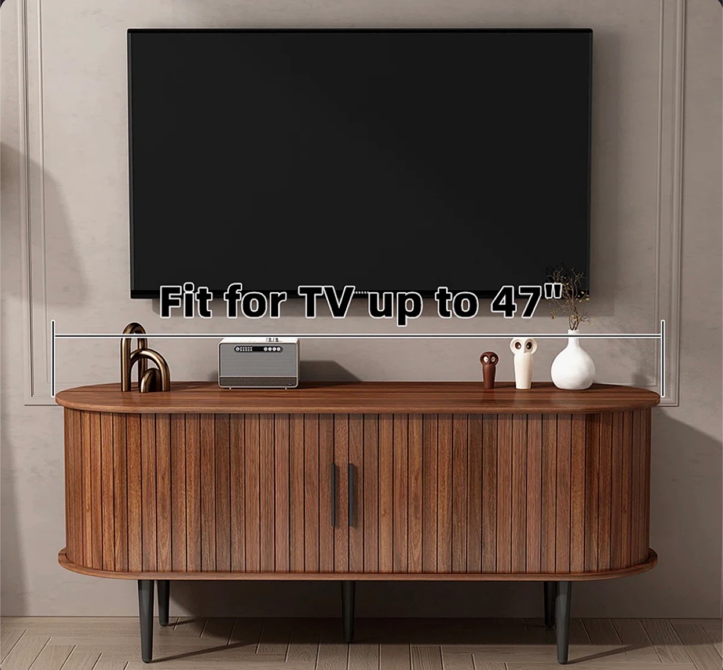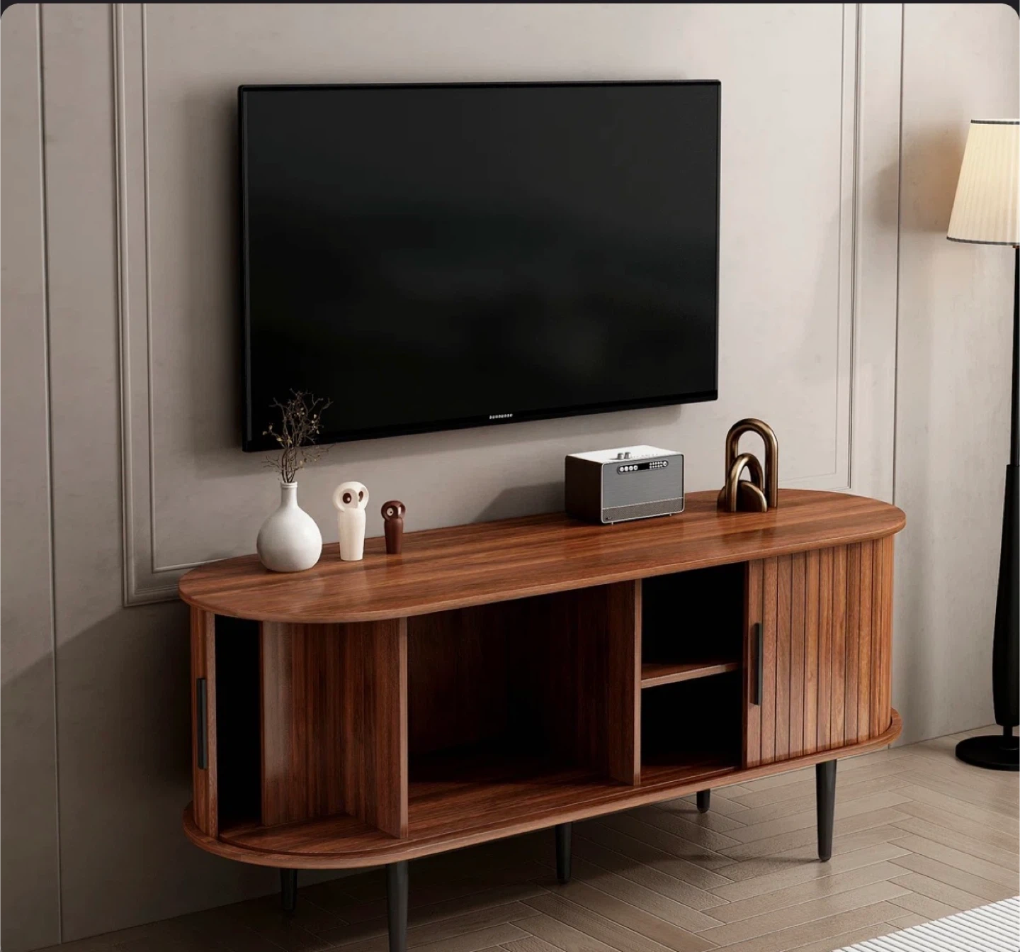 This oval-shaped TV stand is crafted from rich walnut wood with a slatted door design. It features ample storage space for media components and decor. Supports TVs up to 47 inches and has a weight capacity of 150 lbs.
