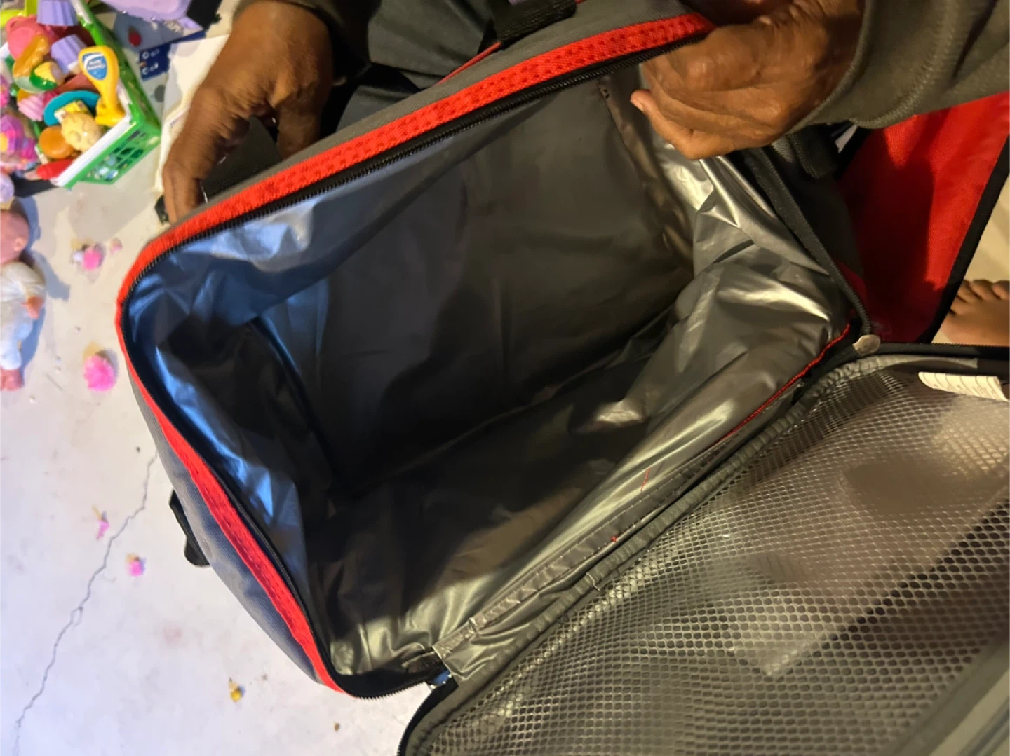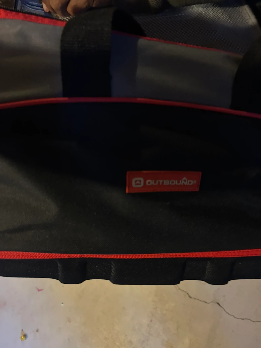 This is an Outbound cooler bag. It features two cup holders integrated into the top lid. The interior is insulated for keeping items cool.