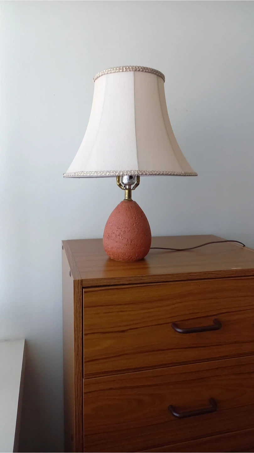 Two Vintage table lamps with a textured terracotta base. It has a classic cream-coloured lampshade with decorative trim. A nice accent for any room!