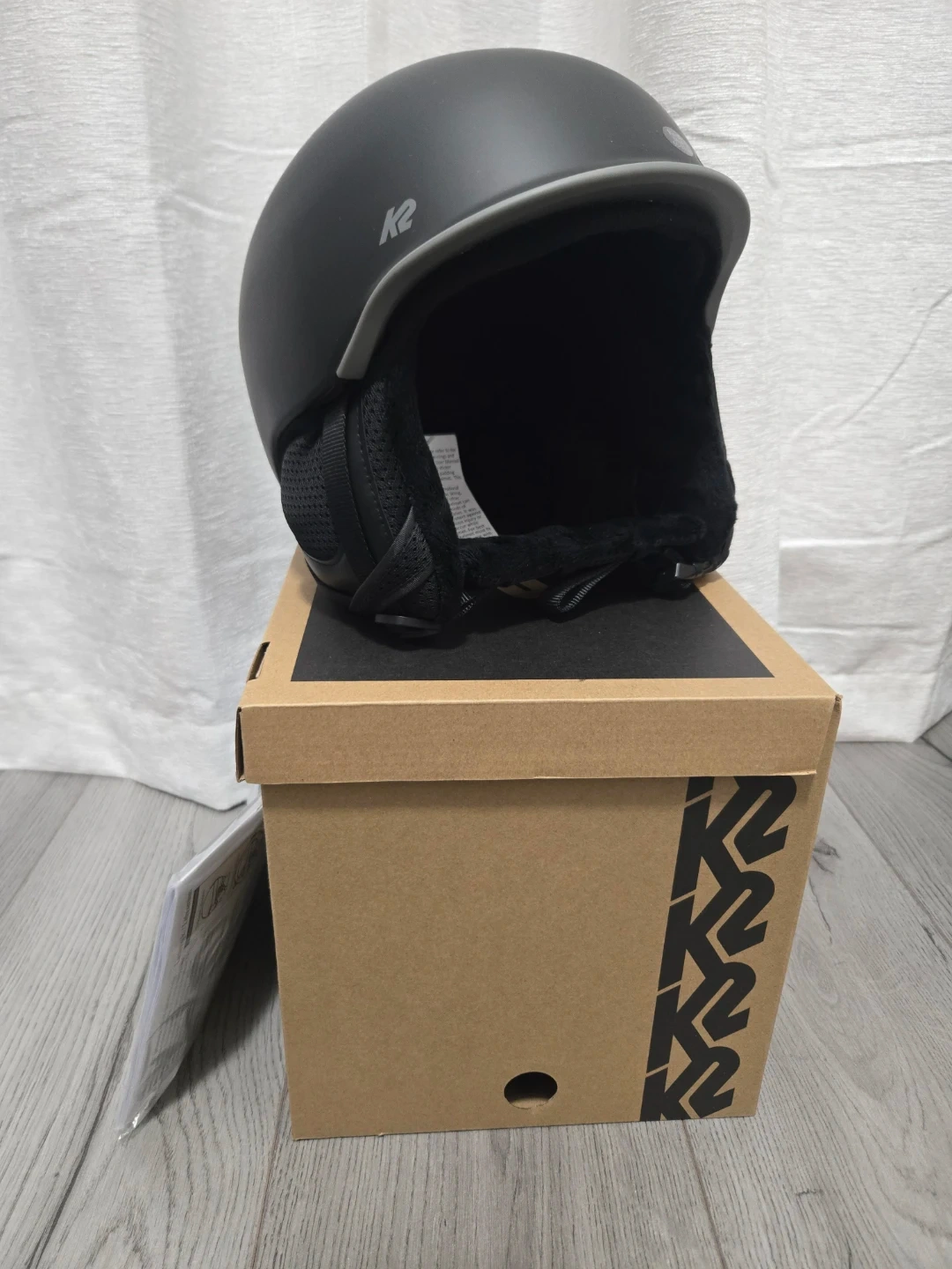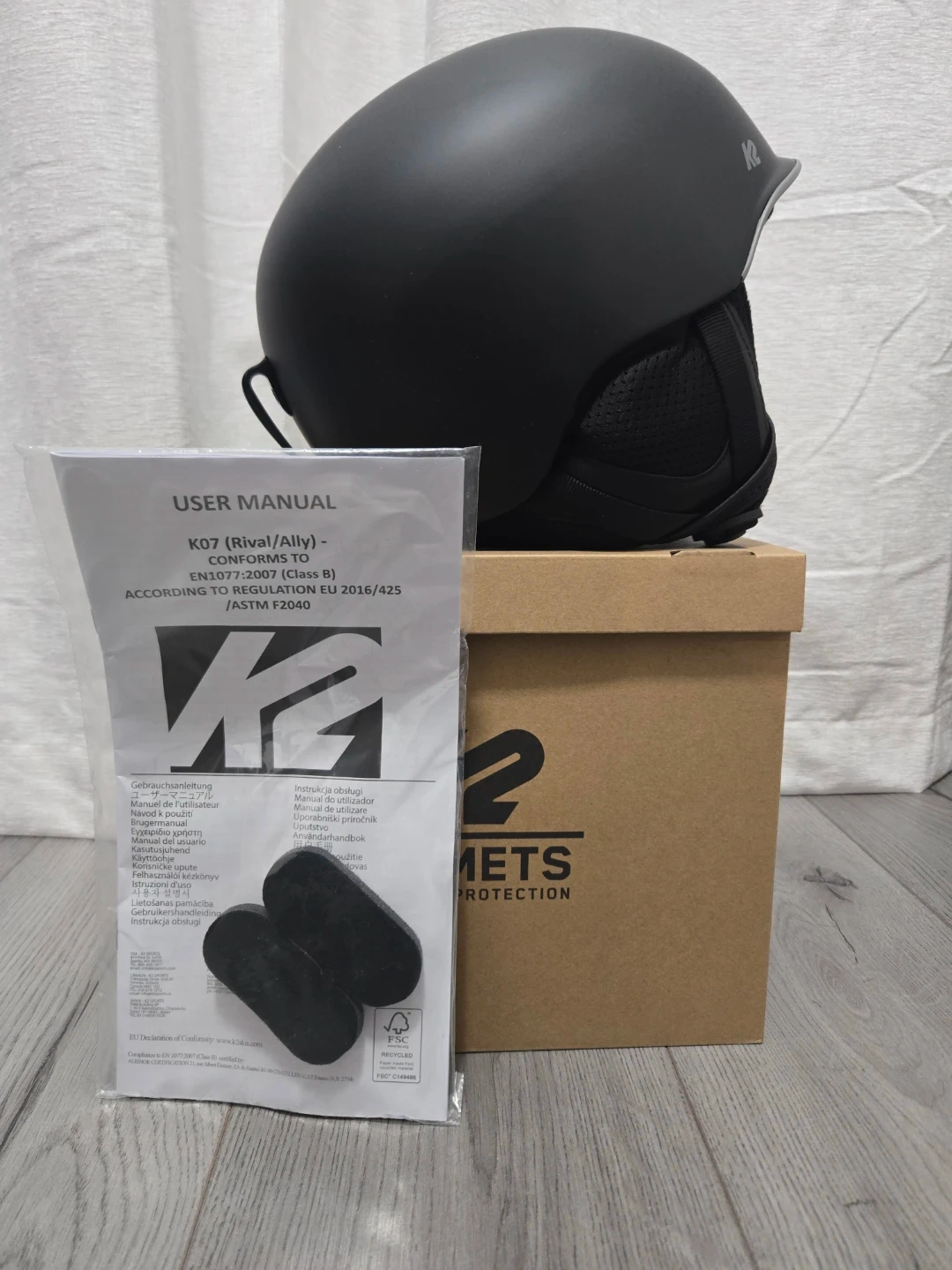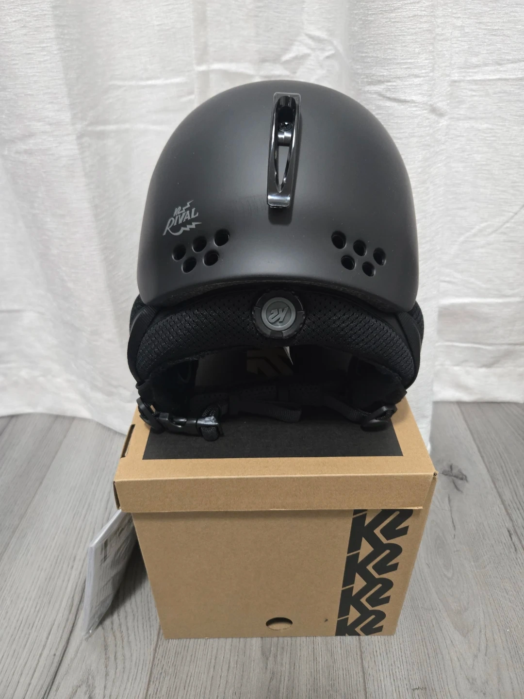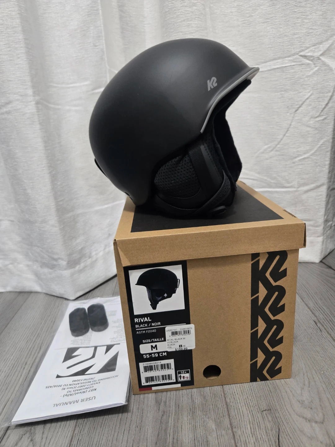 This K2 Rival ski helmet is black and size medium. It includes the original box and user manual. This helmet is designed for winter sports protection.