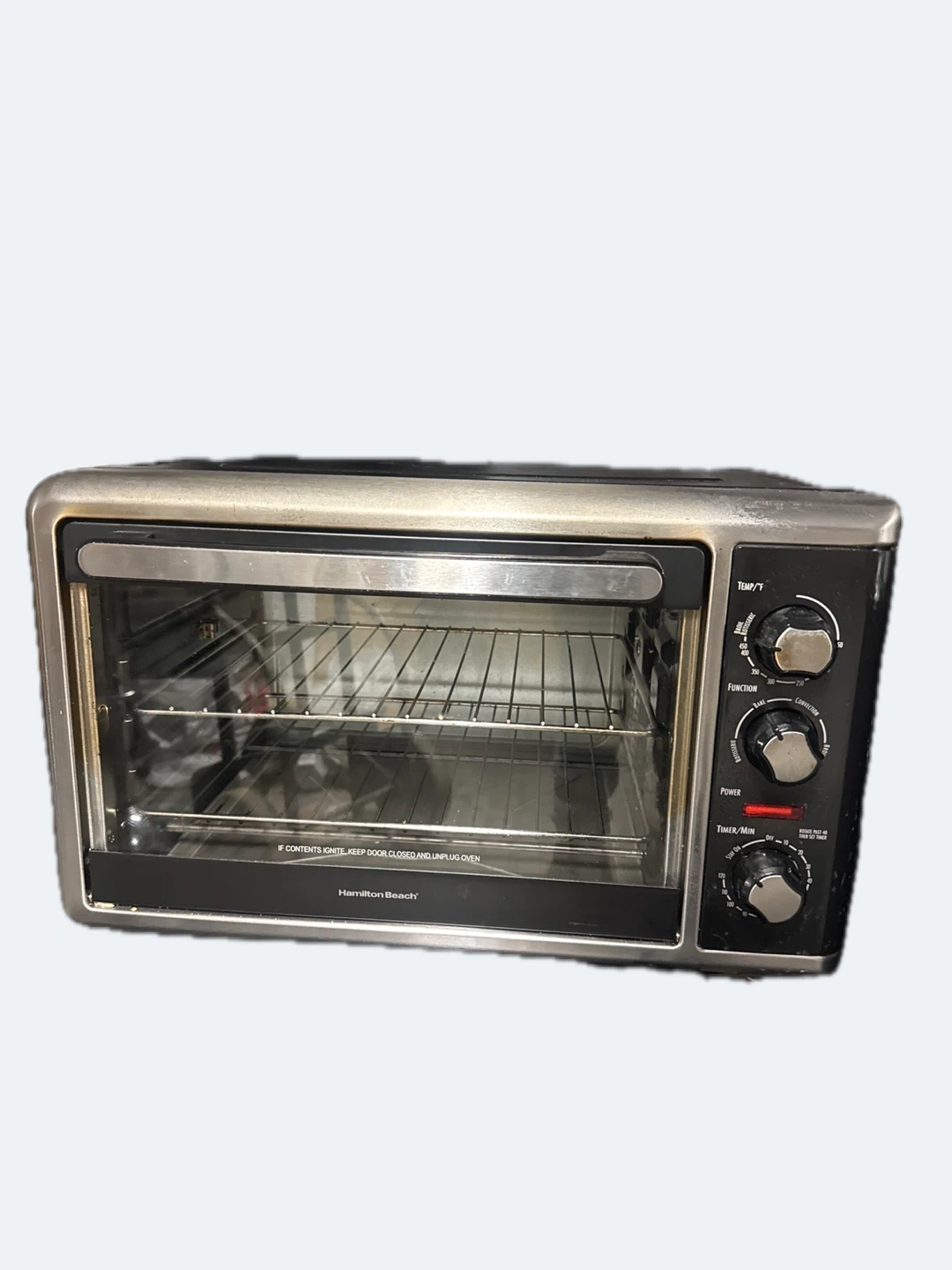 This Hamilton Beach toaster oven has multiple functions and a timer. It's great for baking, toasting, and reheating! It has a stainless steel exterior and interior racks.