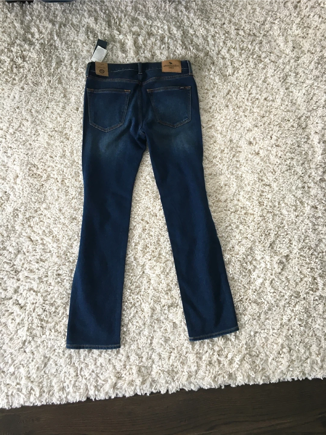 BNWT These are Abercrombie Kids skinny jeans in a size 13/14. They're a dark wash denim with distressed details on the knees. Made in Vietnam.
