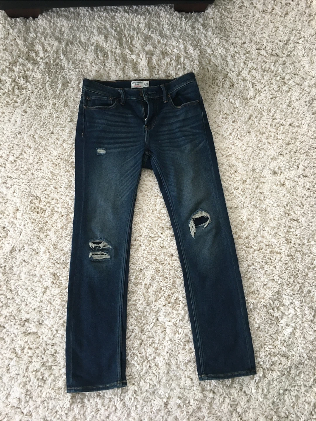 BNWT These are Abercrombie Kids skinny jeans in a size 13/14. They're a dark wash denim with distressed details on the knees. Made in Vietnam.