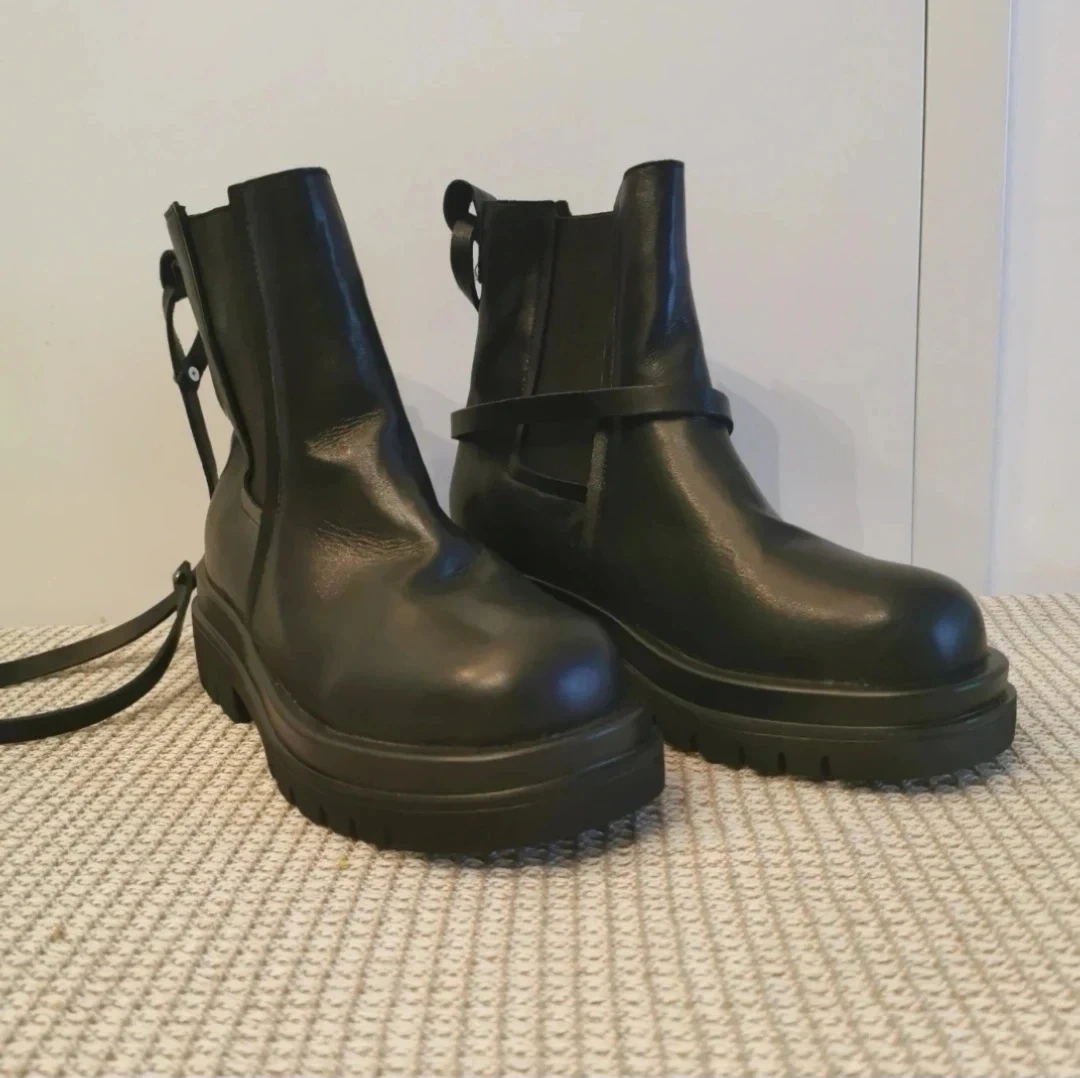 Women's black leather ankle boots. Features a chunky platform sole and unique wrap-around straps. Pull-on style.