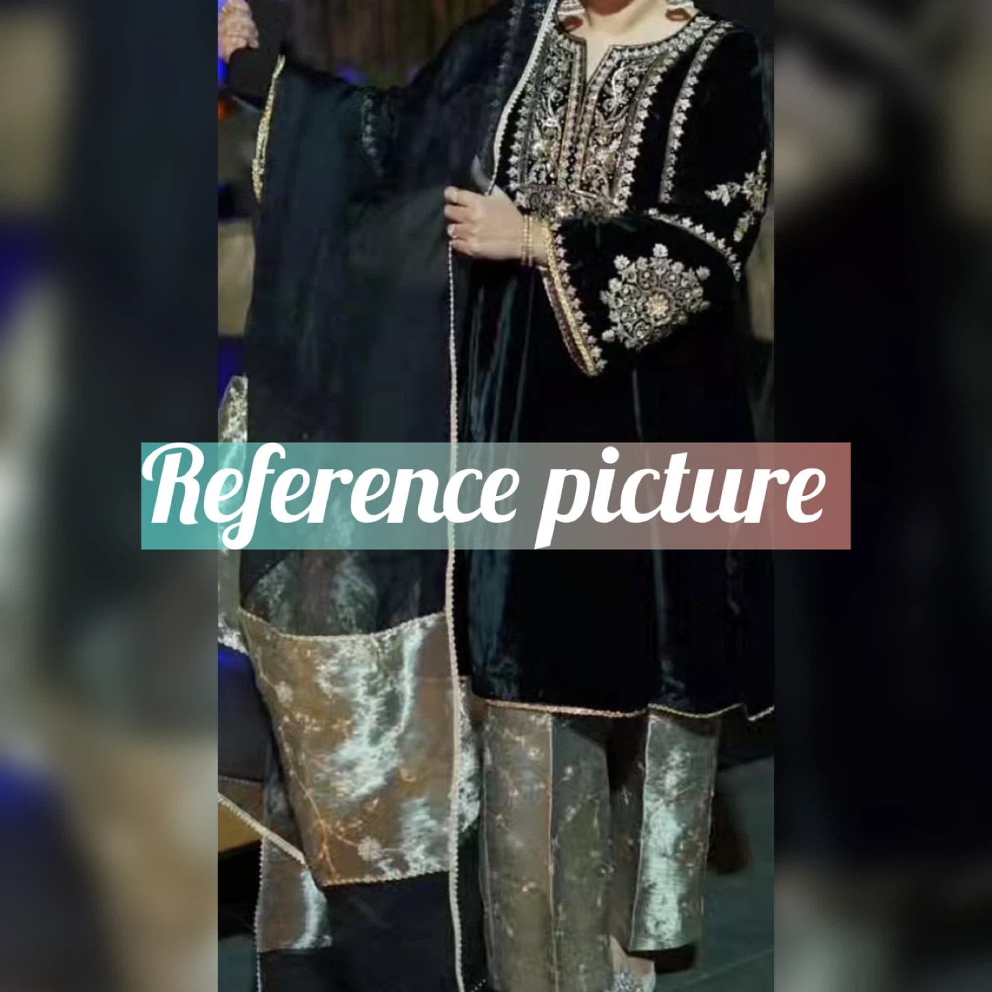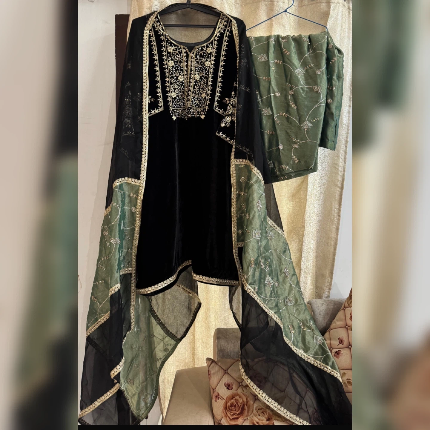 Black velvet kurti adorned with intricate gold embroidery. It's paired with matching trousers and a black chiffon dupatta with green paneled accents. This set is perfect for special occasions.