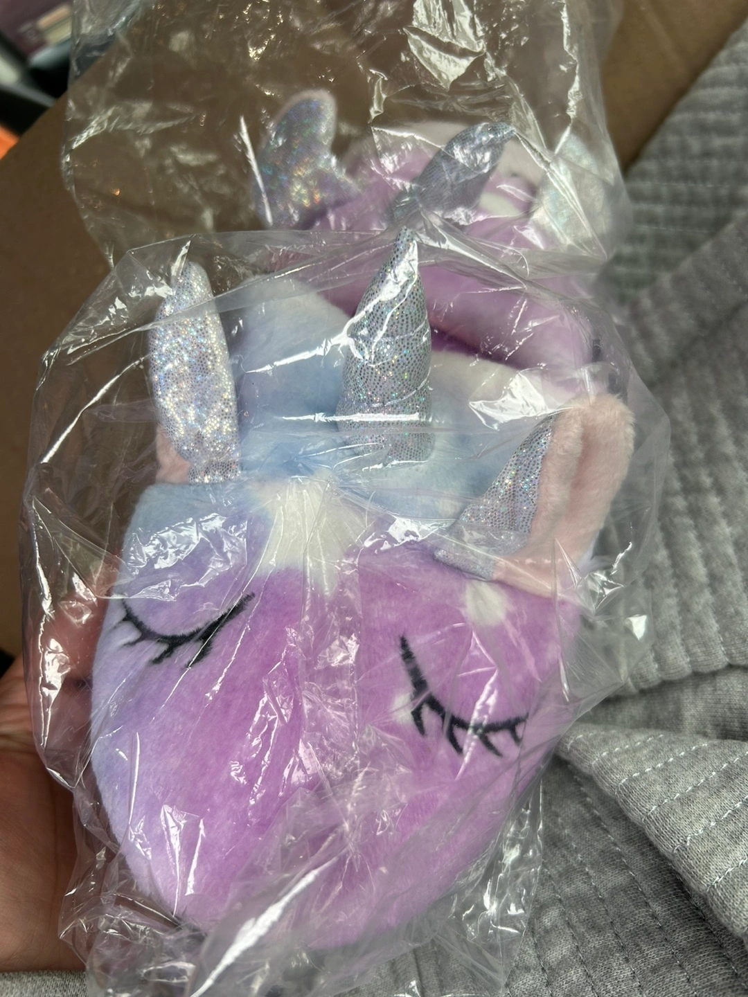 Adorable unicorn slippers, purple and blue tie-dye design. Soft and plush material. Size 7-8. New with tags. Can deliver.