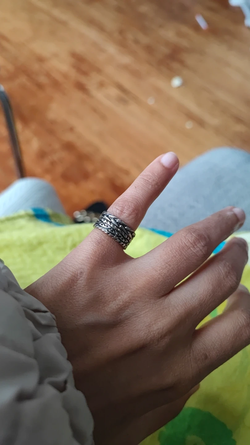 This ring has a unique woven and textured design. It's made of silver-tone metal. This ring is great for adding a bit of detail to any outfit.