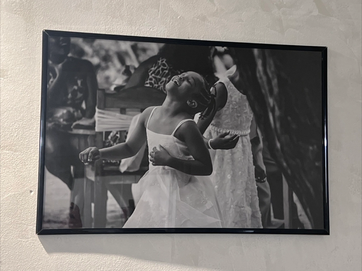 Beautiful black and white photo in a black frame. Features a young girl, laughing while looking up. It is perfect to create a sense of warmth in your home.