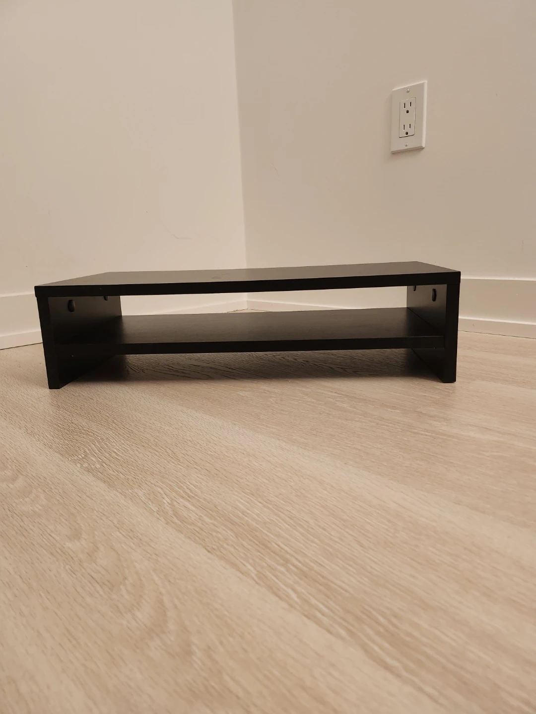 FITUEYES monitor stand with two tiers for organizing your desk. It's black and made of wood. Provides extra storage for your computer setup.