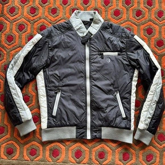 Pre-owned jacket in very good condition. It has a racer style look to it, in a puffer jacket material. Black, white and gray in colour.
