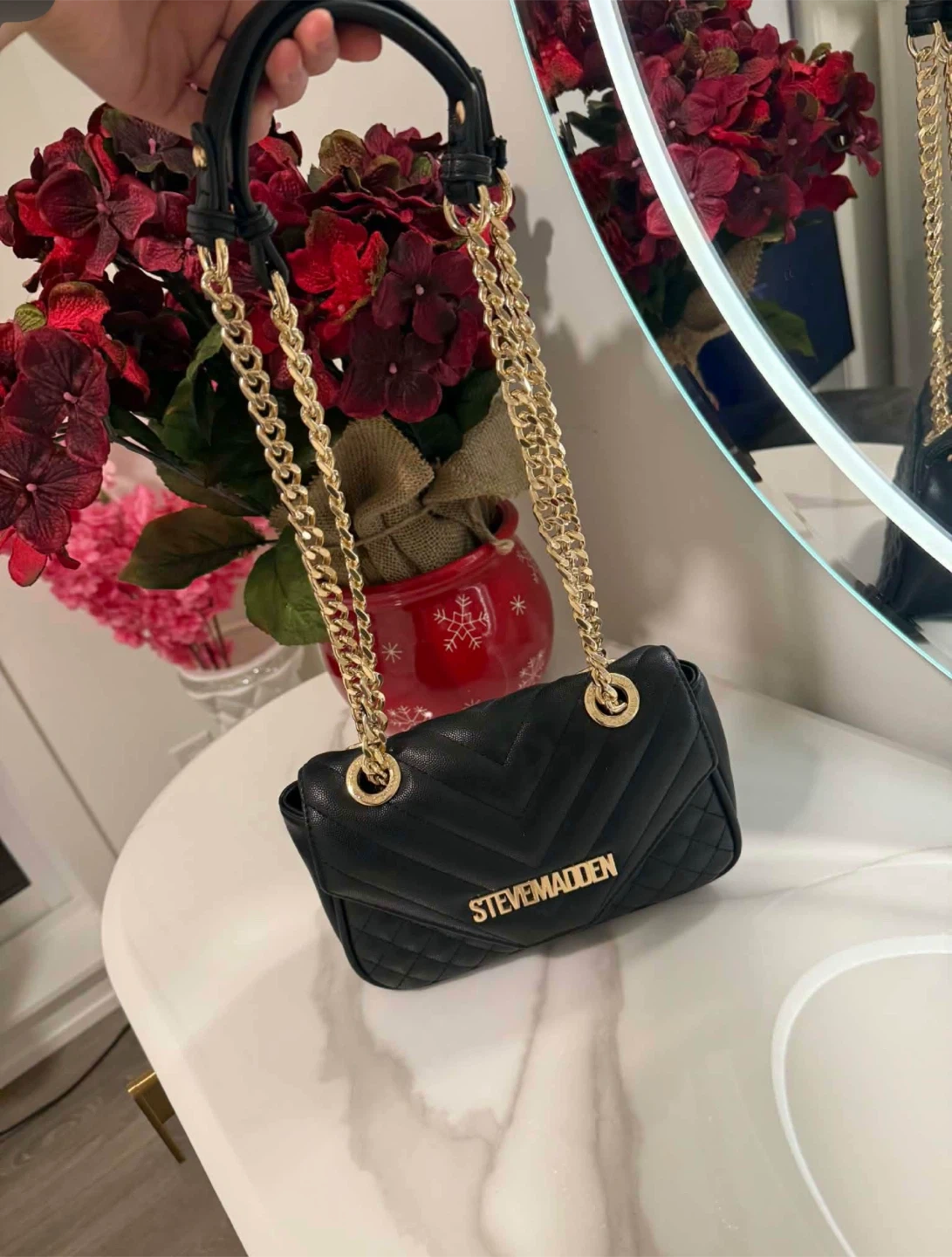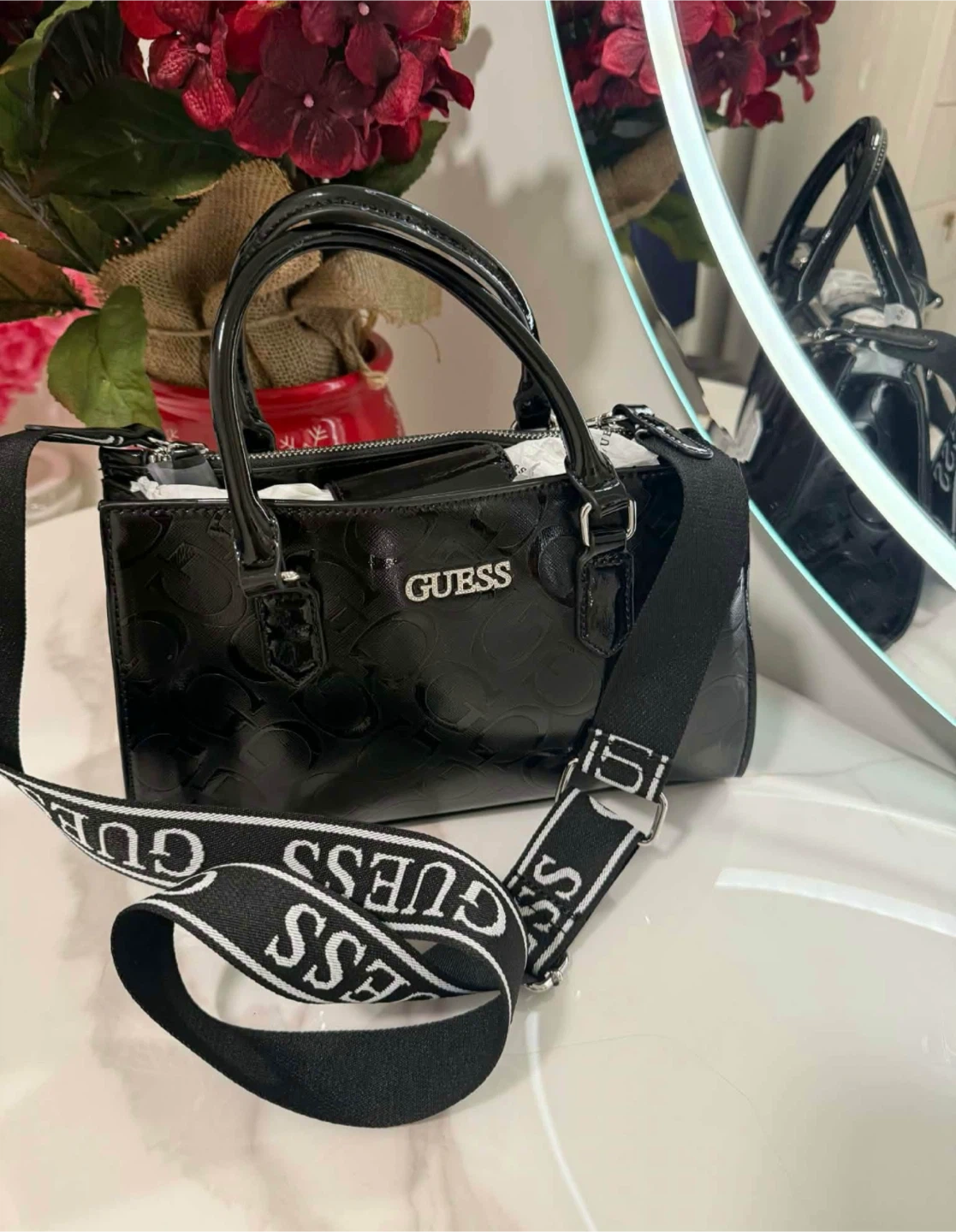 This is a black patent leather Guess shoulder bag with a patterned exterior. It comes with a detachable logo strap and a gold chain strap. Great for everyday use or a night out!
