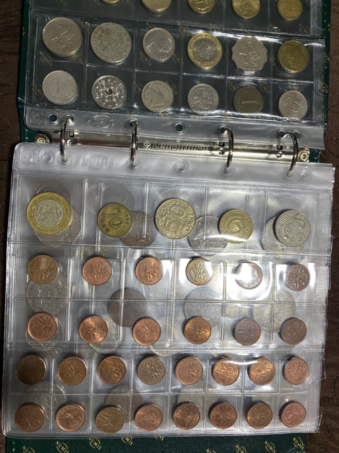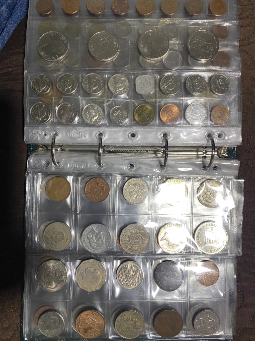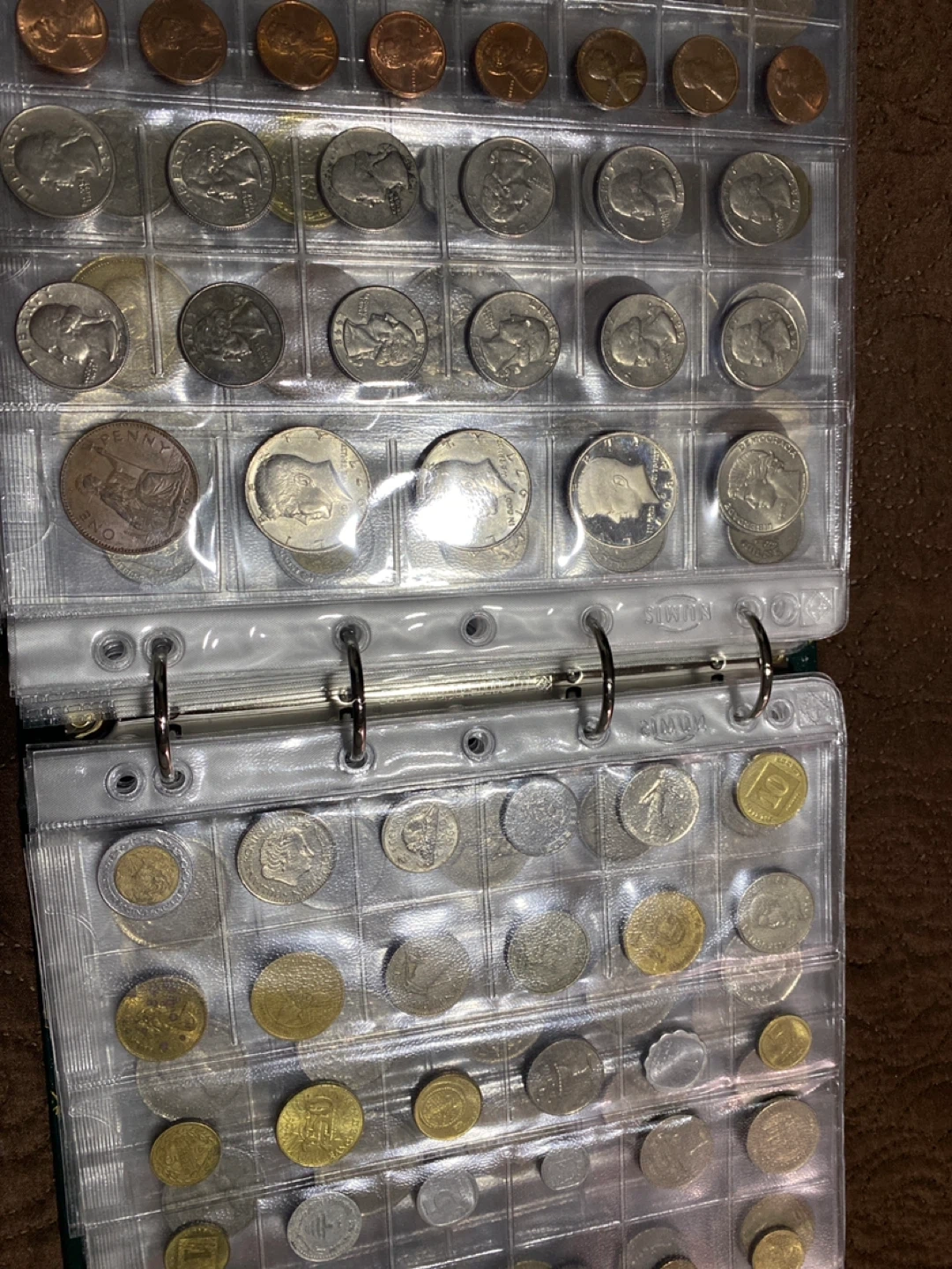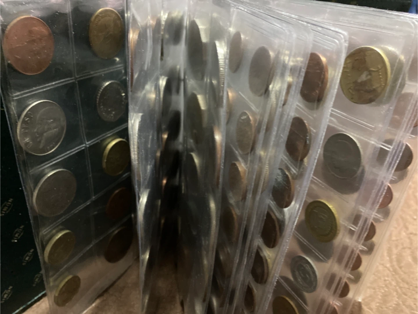This is a collection of various coins from different countries. It includes a mix of denominations and designs. The coins are housed in a clear plastic binder for organization and protection. 300 pieces