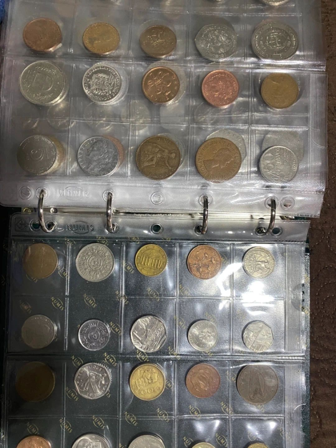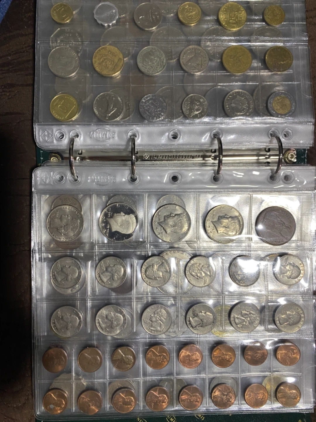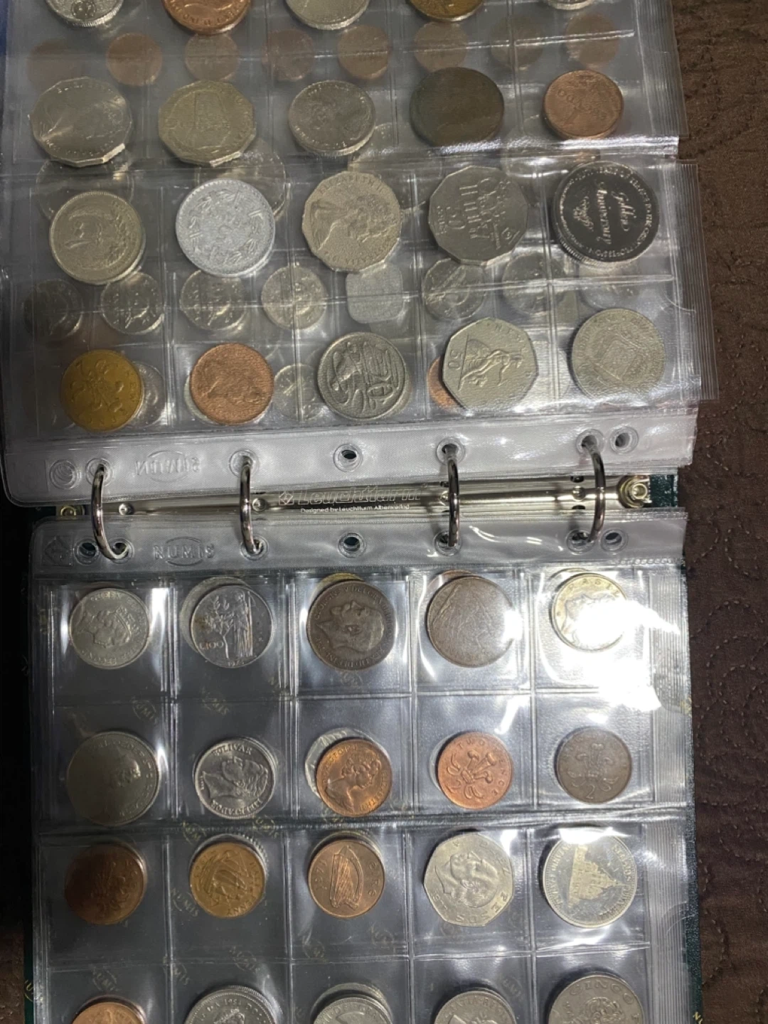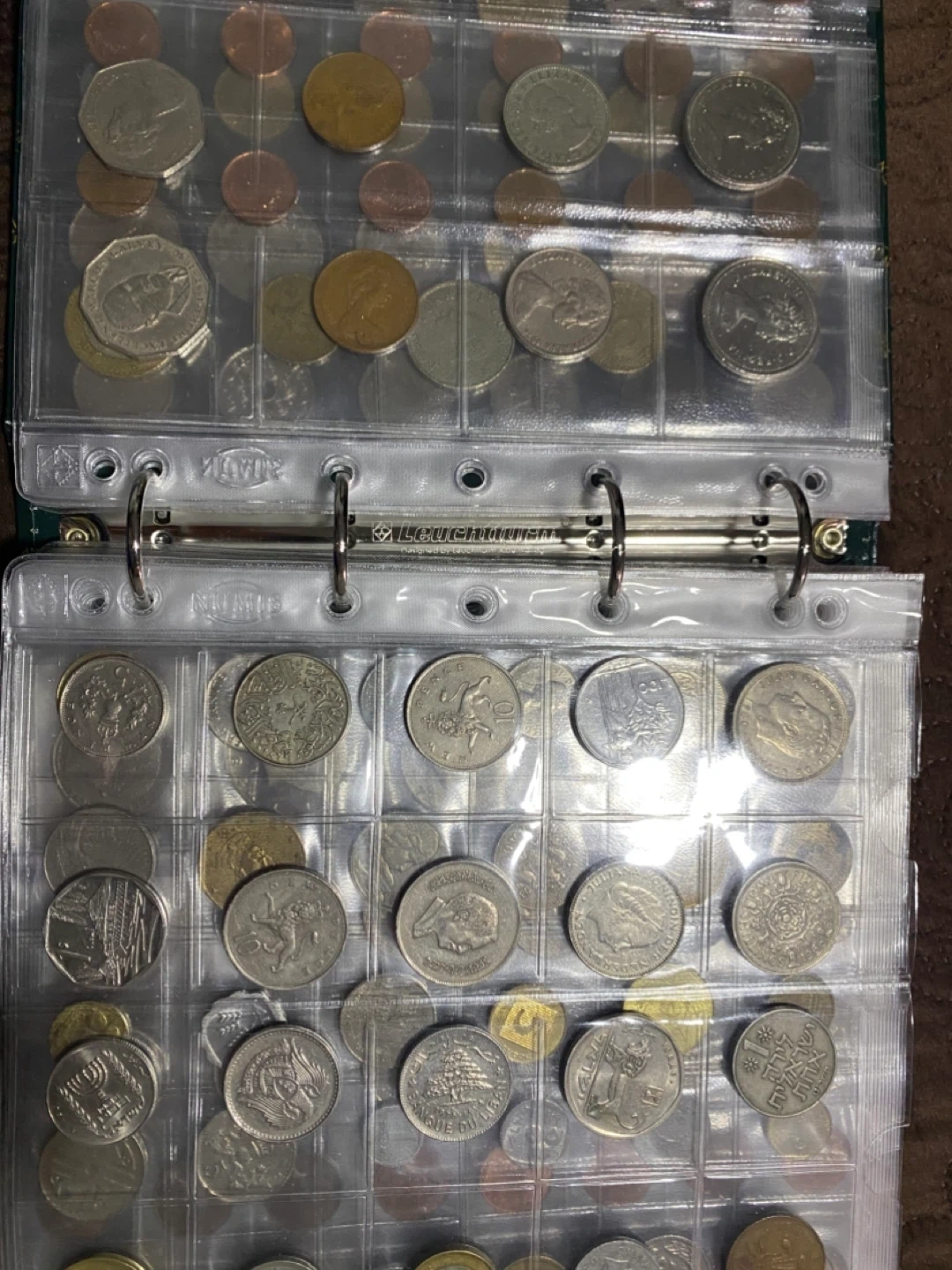 This is a collection of various coins from different countries. It includes a mix of denominations and designs. The coins are housed in a clear plastic binder for organization and protection. 300 pieces