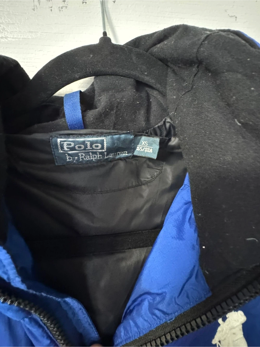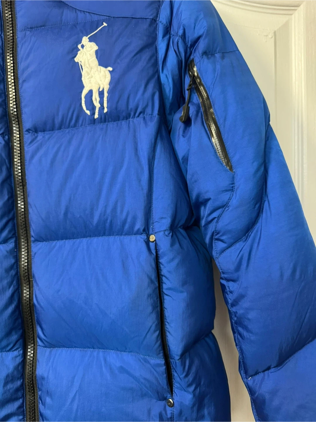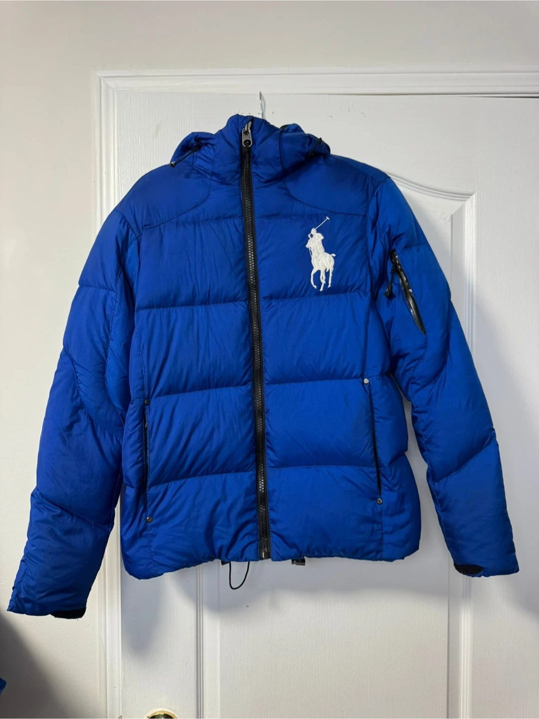 Blue Ralph Lauren puffer jacket with the signature polo player logo. It's a size XS. This jacket is great for cooler weather!