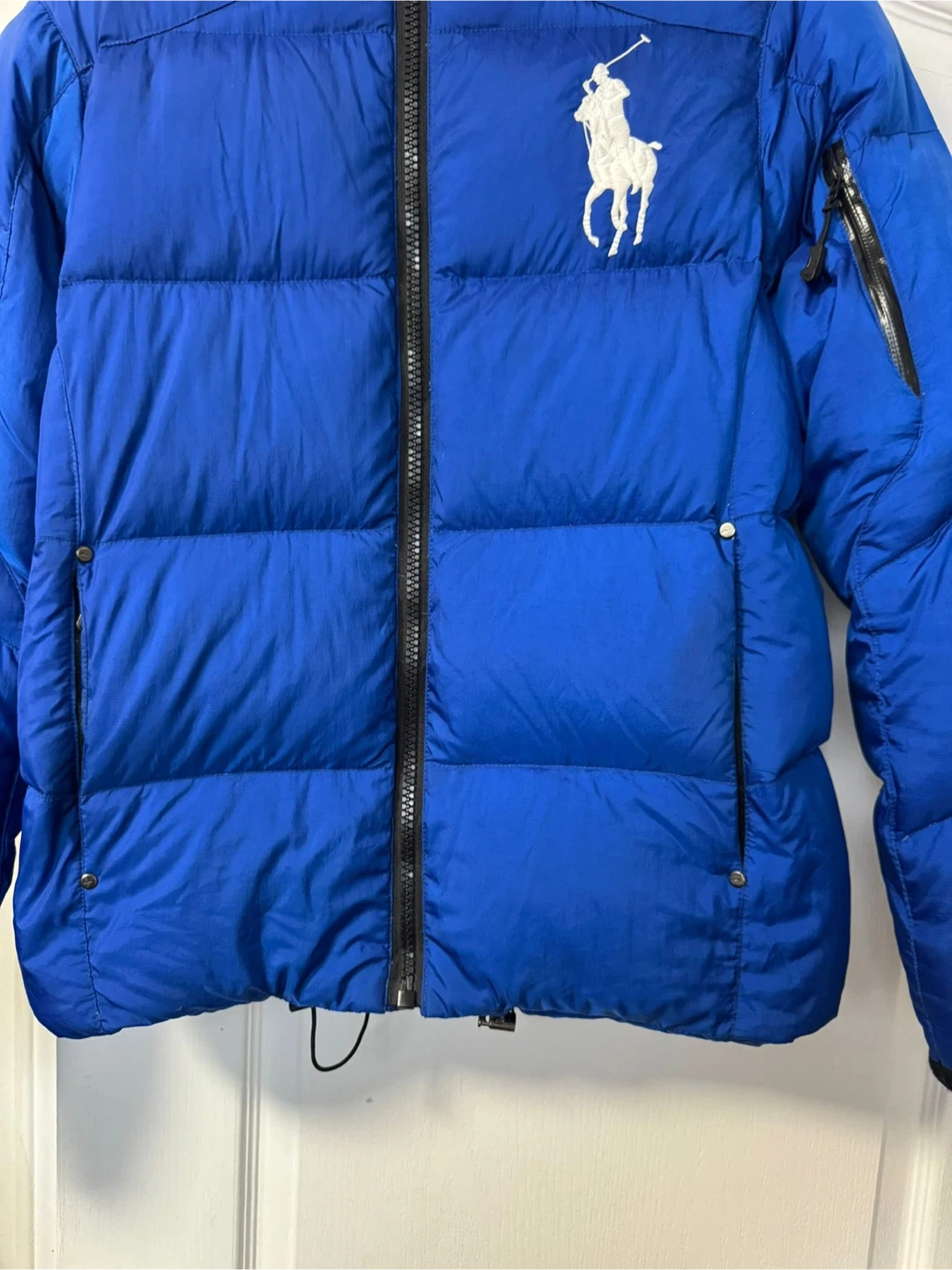 Blue Ralph Lauren puffer jacket with the signature polo player logo. It's a size XS. This jacket is great for cooler weather!