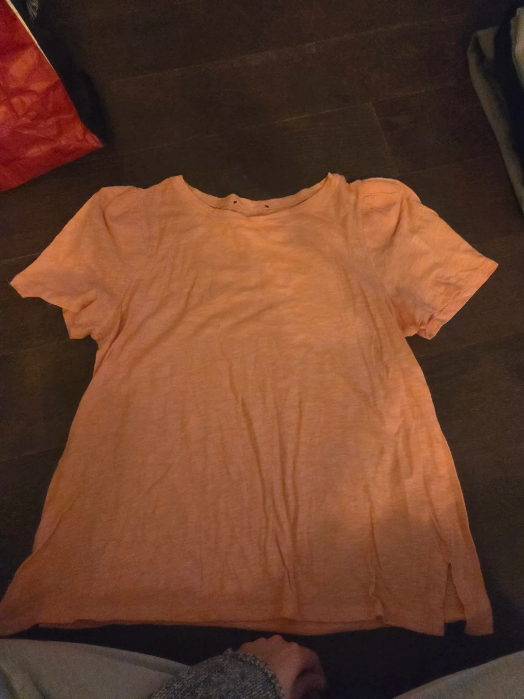 A simple orange t-shirt with short sleeves. It's made of a soft, lightweight material. This shirt is great for everyday wear.