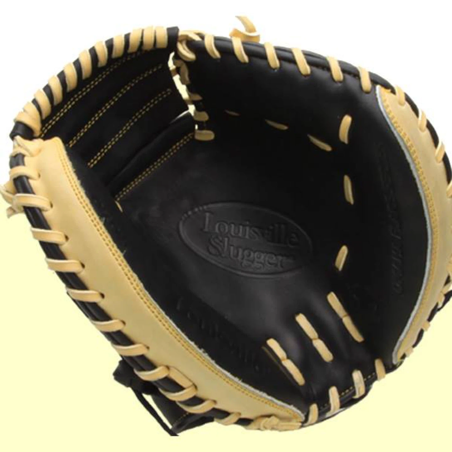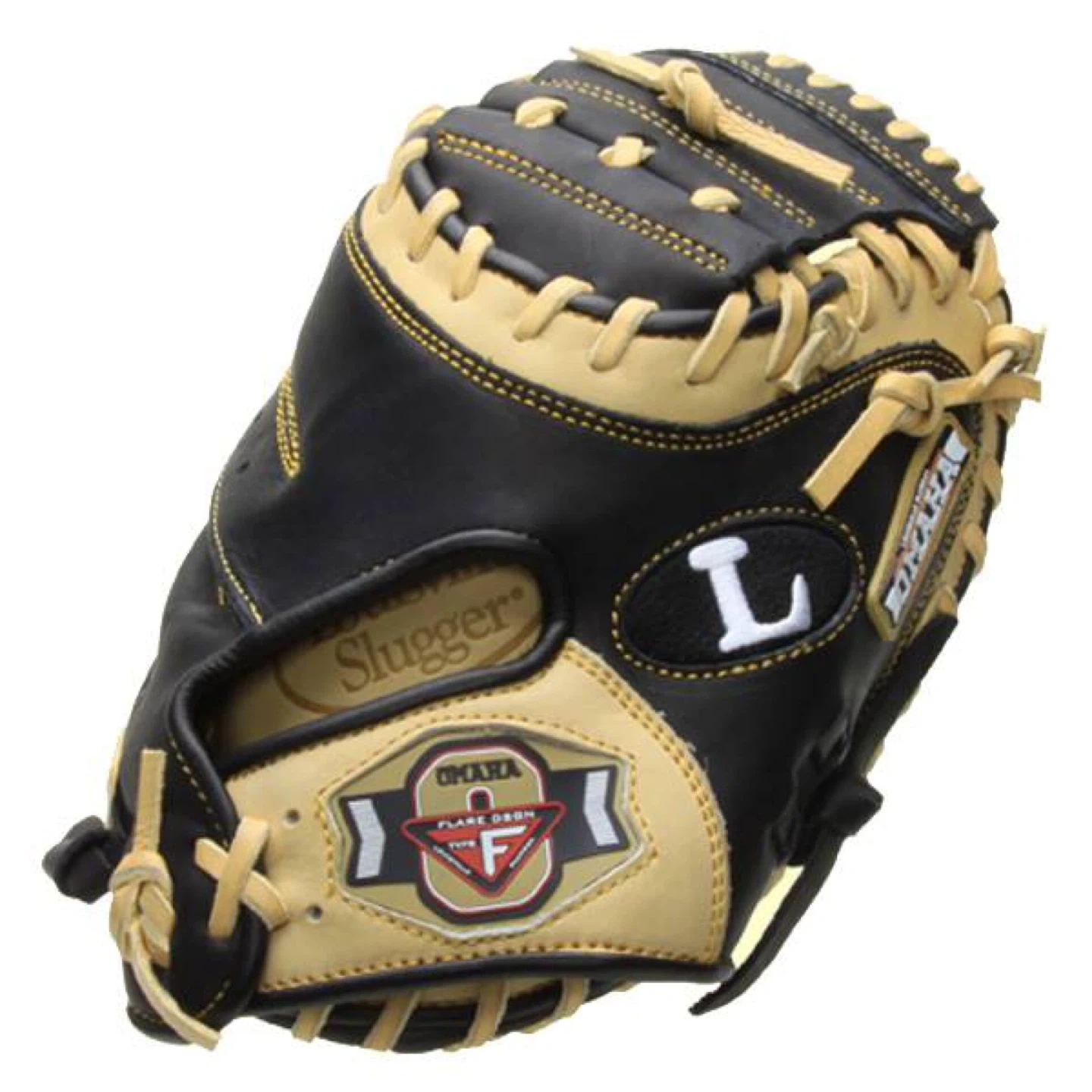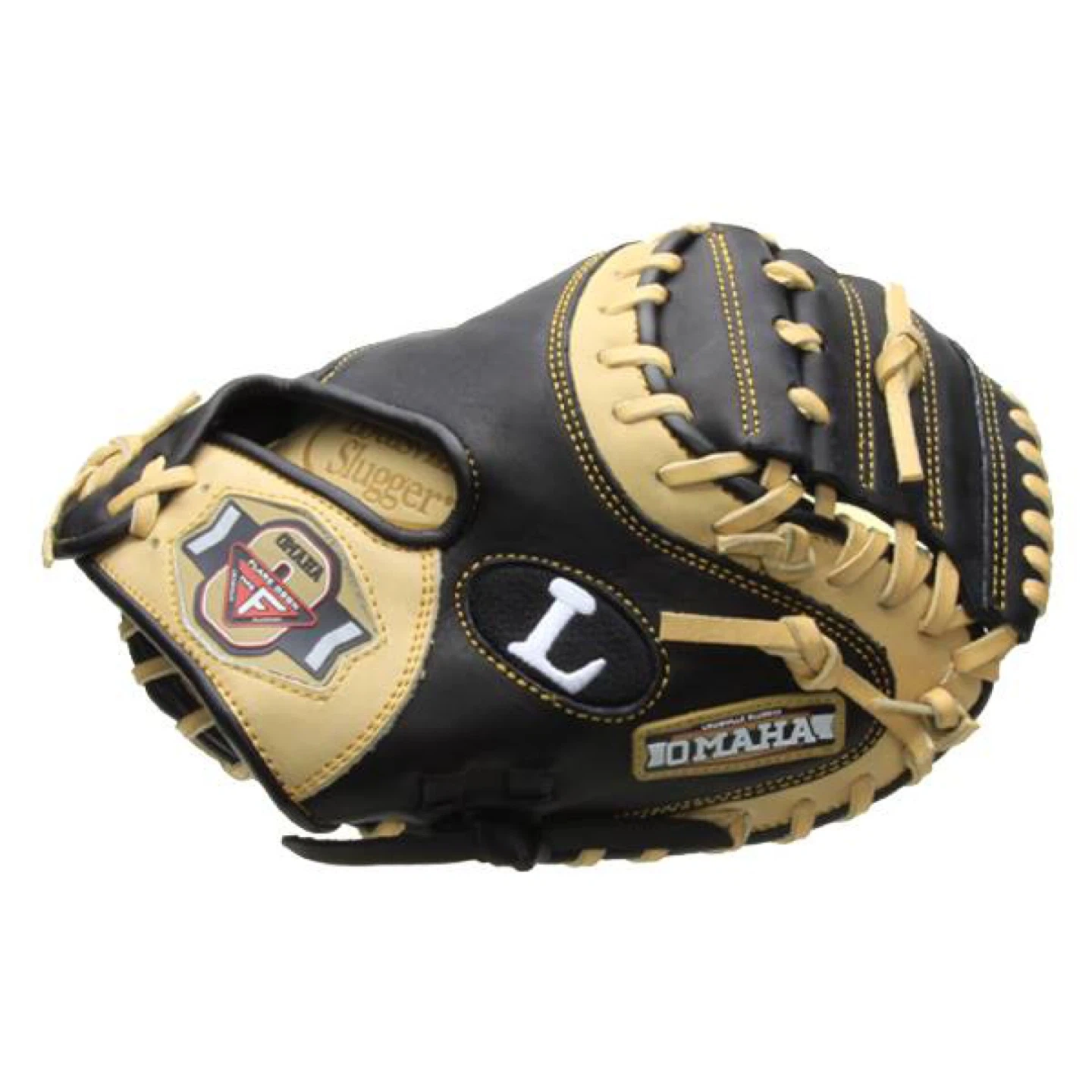 This is a Louisville Slugger Omaha TPX catcher's mitt. It's black and tan leather with yellow stitching. Perfect for catcher for a baseball team!