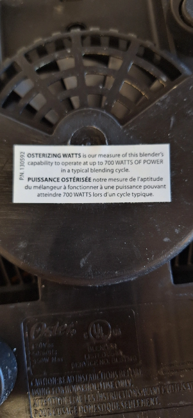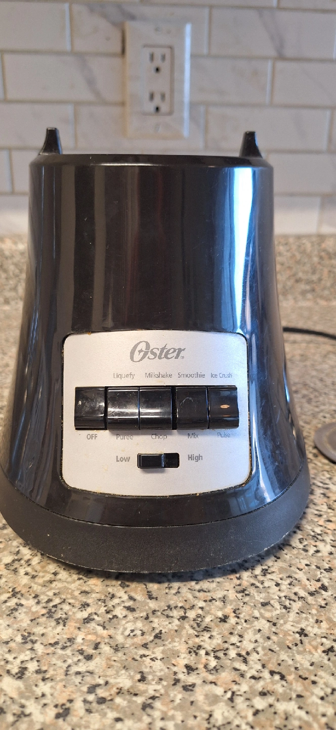 Selling an Oster blender base. It has settings for liquefy, milkshake, smoothie, and ice crush. Includes the blade and a rubber ring. It operates at up to 700 watts of power