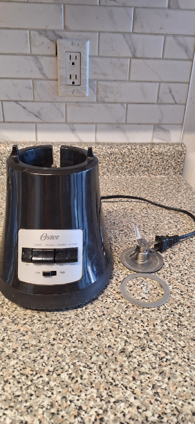 Selling an Oster blender base. It has settings for liquefy, milkshake, smoothie, and ice crush. Includes the blade and a rubber ring. It operates at up to 700 watts of power