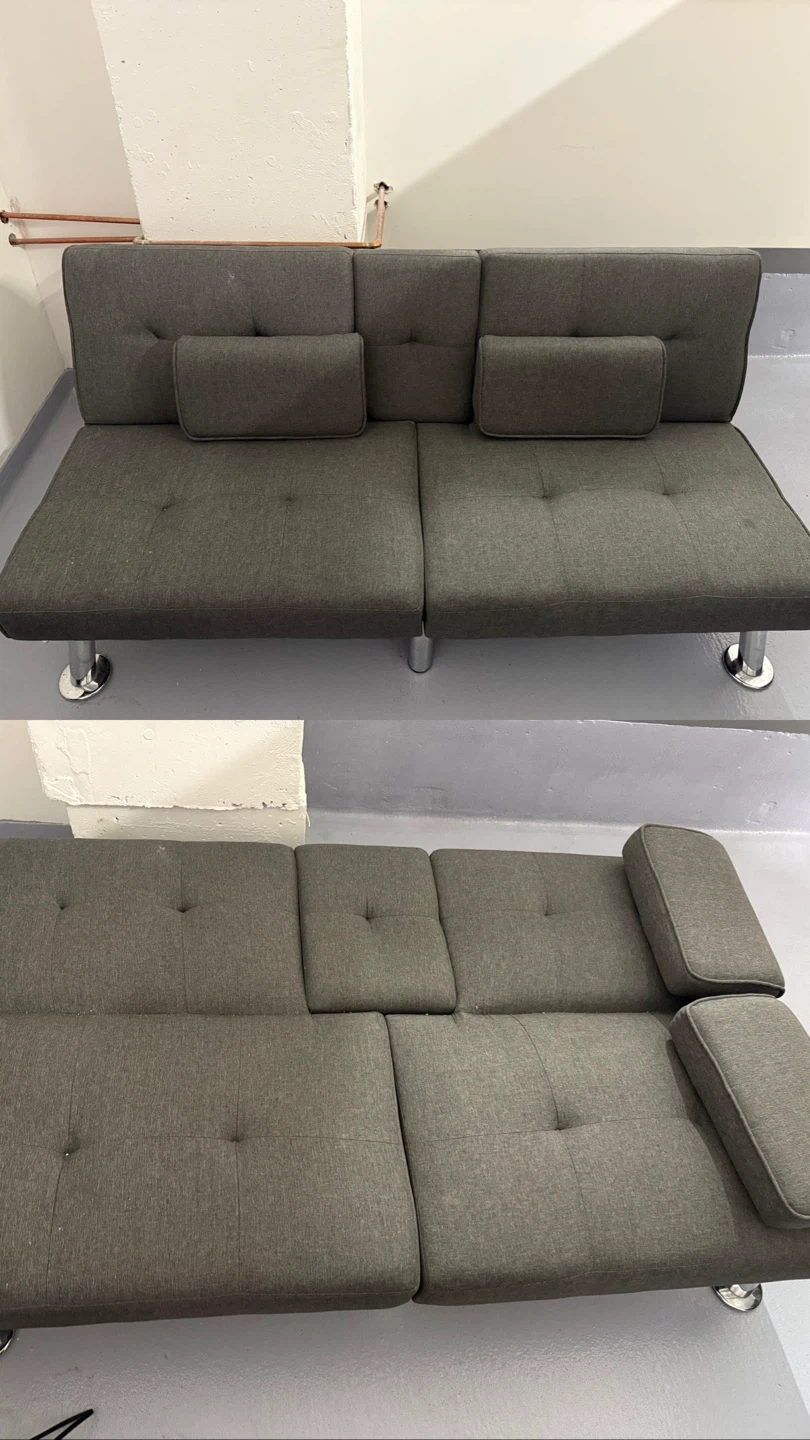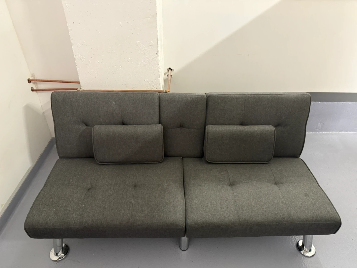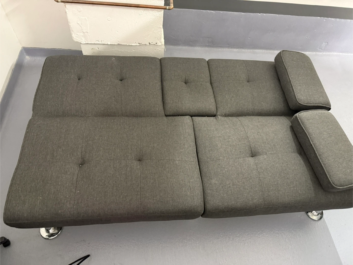 Giving away a gray futon sofa bed. It's in good condition and perfect for small spaces or a guest room. The futon easily converts from a sofa to a bed.