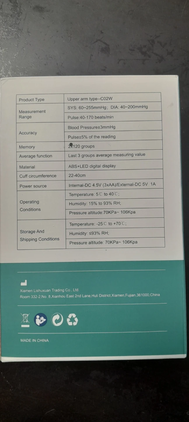This is a RELADO blood pressure monitor, model C02W. It has a measurement range of 60-255mmHg for SYS and 40-200mmHg for DIA. The cuff circumference is adjustable from 22-40cm. This device is suitable for at-home use.