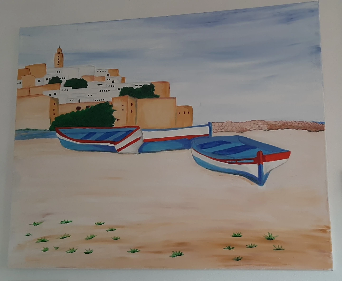This is a canvas painting depicting several colourful boats resting on a sandy beach facing the Oudayas Qasbah with its white buildings and a minaret. This serene coastal scene will add characterto your room and art collection.
