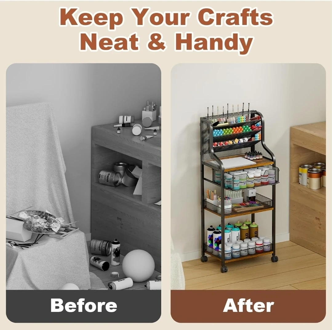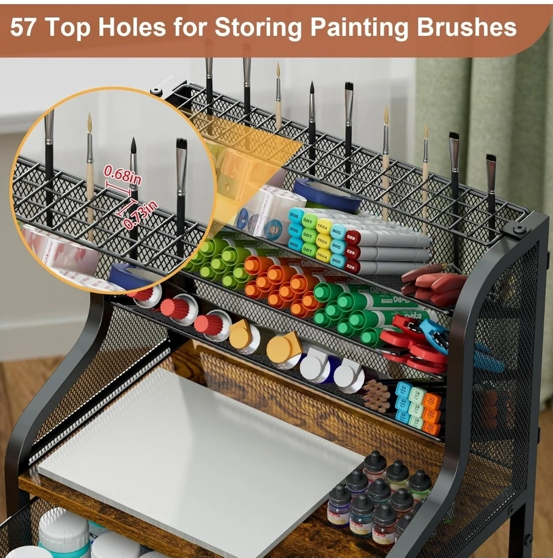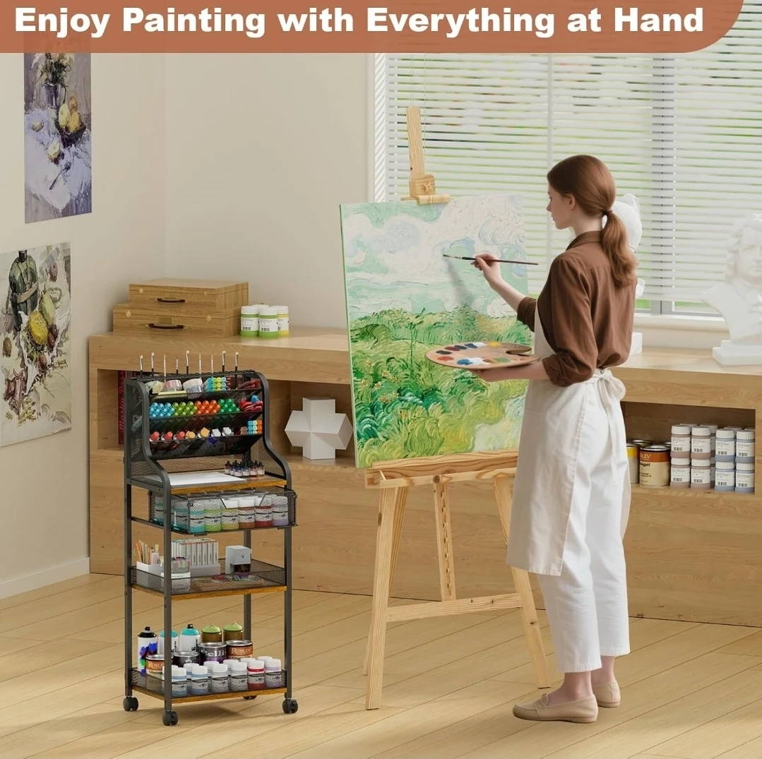 This metal craft storage cart offers great organization for your art supplies. It features multiple tiers, including mesh baskets and drawers, plus dedicated holders for painting brushes. The cart includes 360° lockable wheels for easy mobility. It's perfect for keeping your creative space tidy and all your essentials within reach!