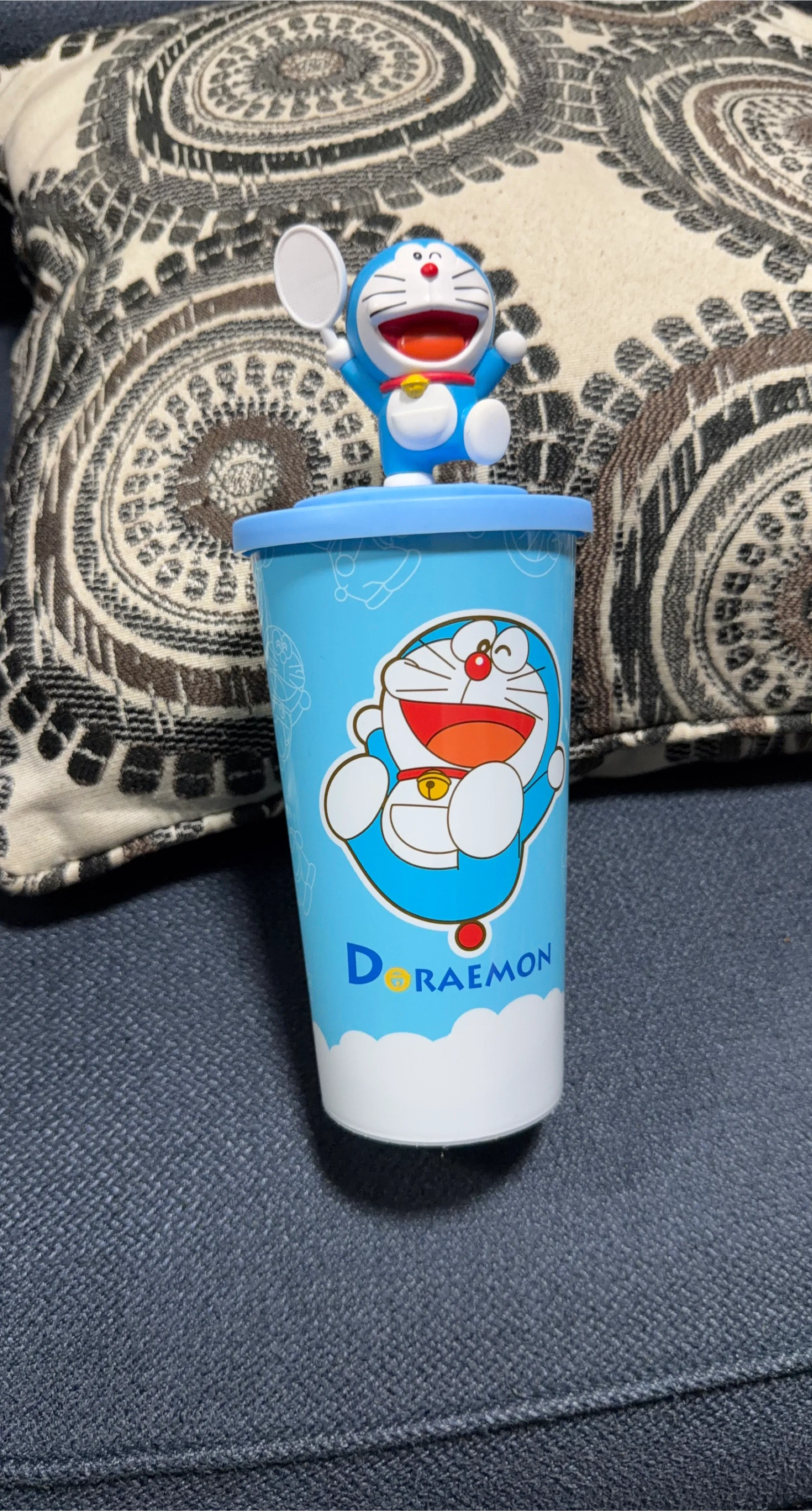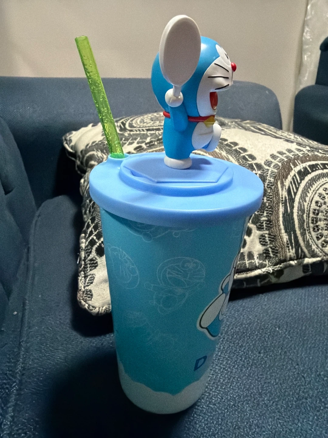 This blue cup features a fun Doraemon character design. It comes with a lid and a green straw, topped with a small Doraemon figure. Great for drinks or as a collectible.