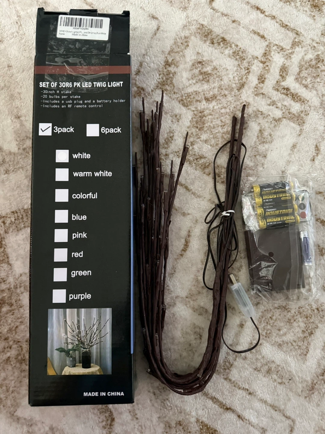 SET OF 3 PK LED TWIG LIGHT with 20 inch H stake. Includes a USB plug and a battery holder. Includes an on/off remote control. Batteries are included.