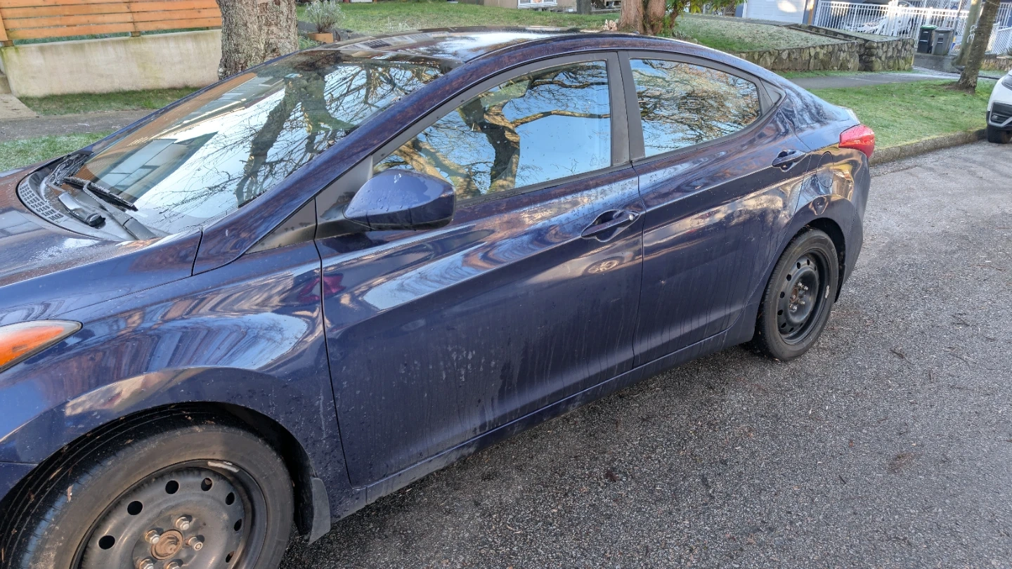 This is a used blue Hyundai Elantra sedan. It's a four-door car. It's been well-used and shows signs of wear. Great for getting around town!