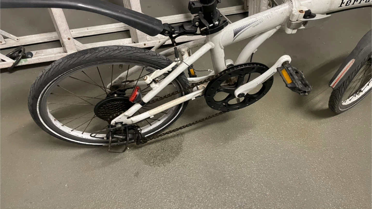 White Ferrari folding bike with a RevoShift gear system. It has front and rear fenders for added practicality. This bike is great for commuting or recreational rides.