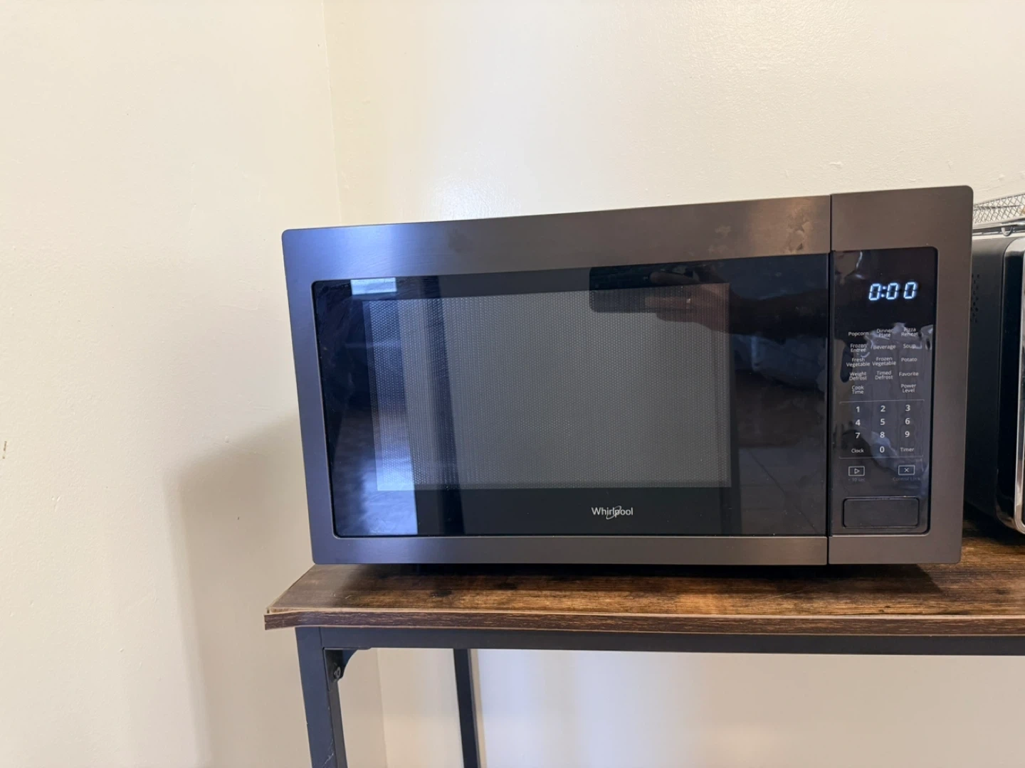 This is a Whirlpool microwave oven in a charcoal grey finish. It has a capacity of 1.6 cu. ft. and features a digital display with various cooking presets. The unit measures 16.5" H x 21.7" W x 19.7" D.