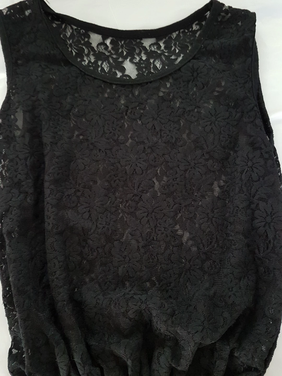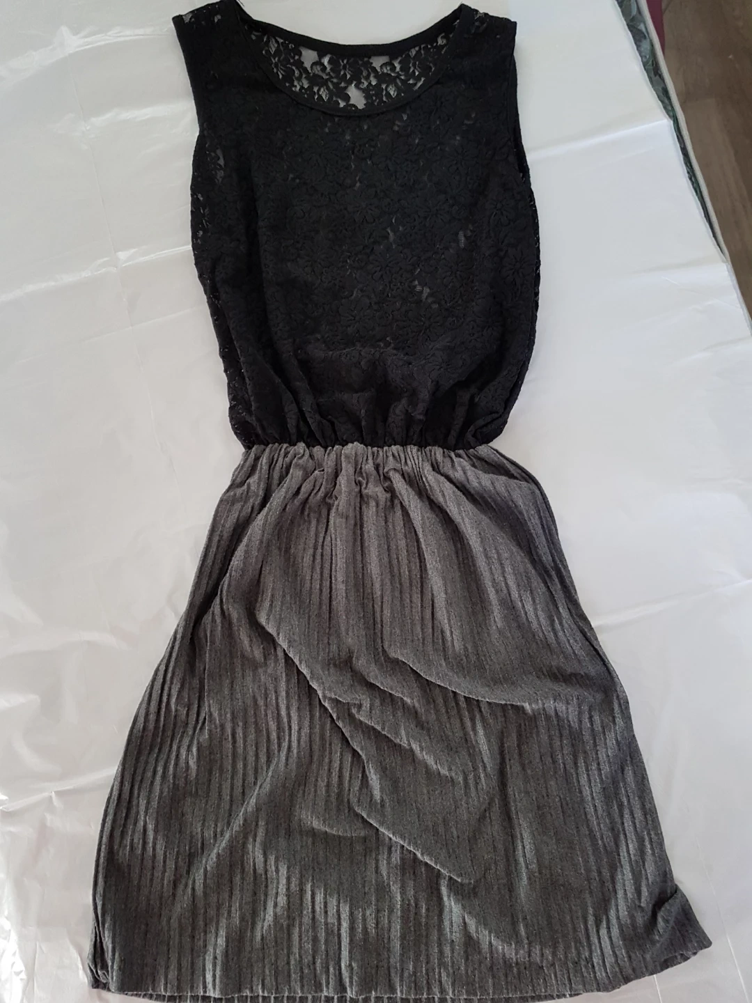 This sleeveless dress features a black lace top with a rounded neckline and a grey pleated skirt. It has an elastic waistband for a comfortable fit. It's a stylish piece for various occasions. Size small