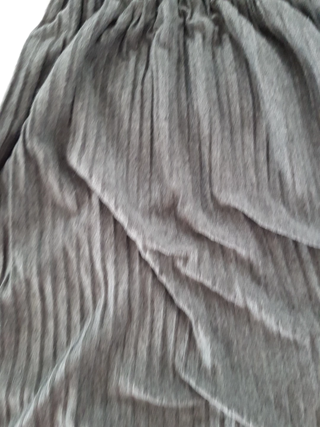 This sleeveless dress features a black lace top with a rounded neckline and a grey pleated skirt. It has an elastic waistband for a comfortable fit. It's a stylish piece for various occasions. Size small