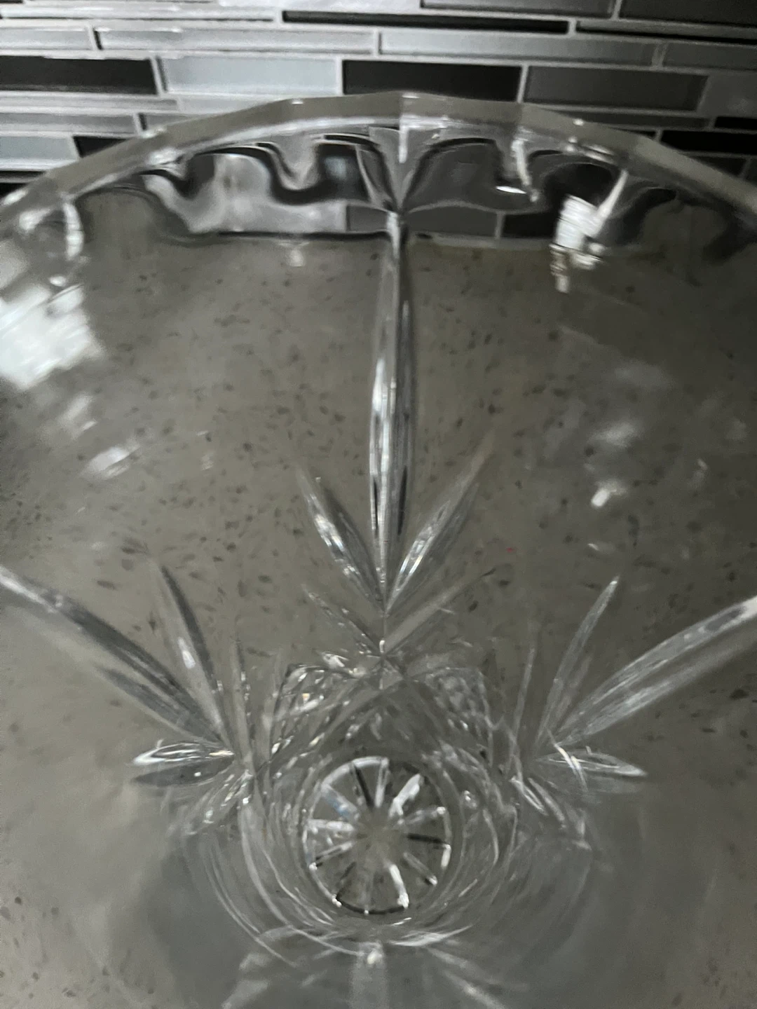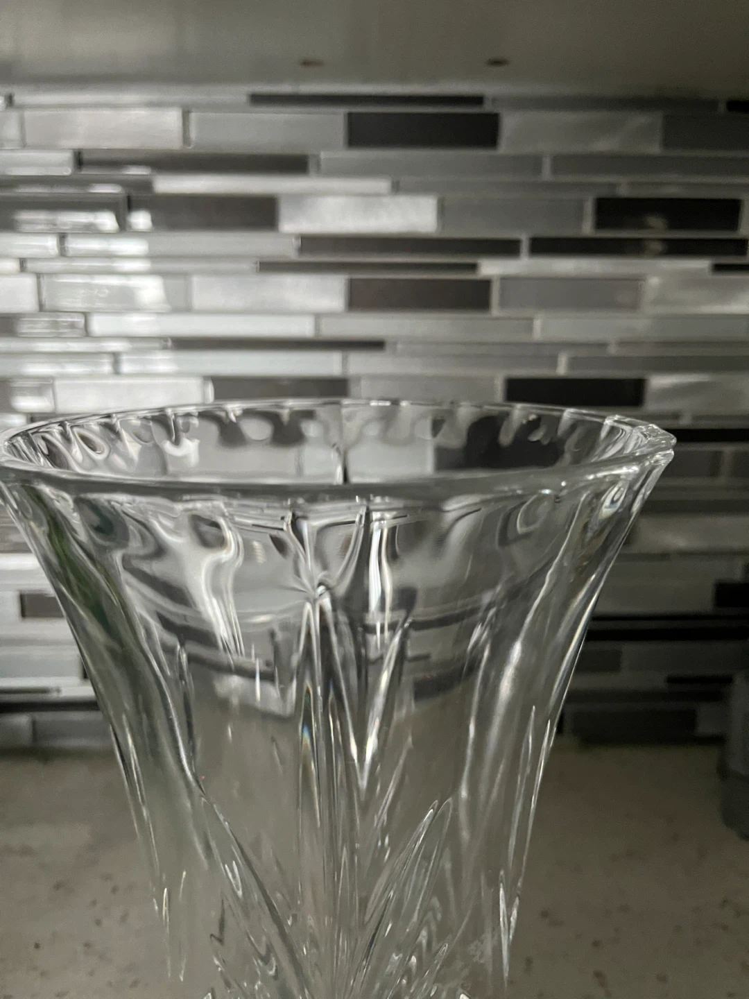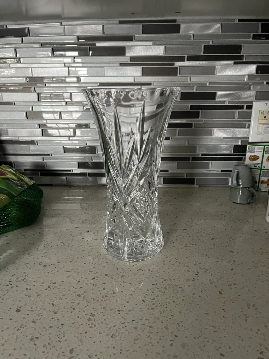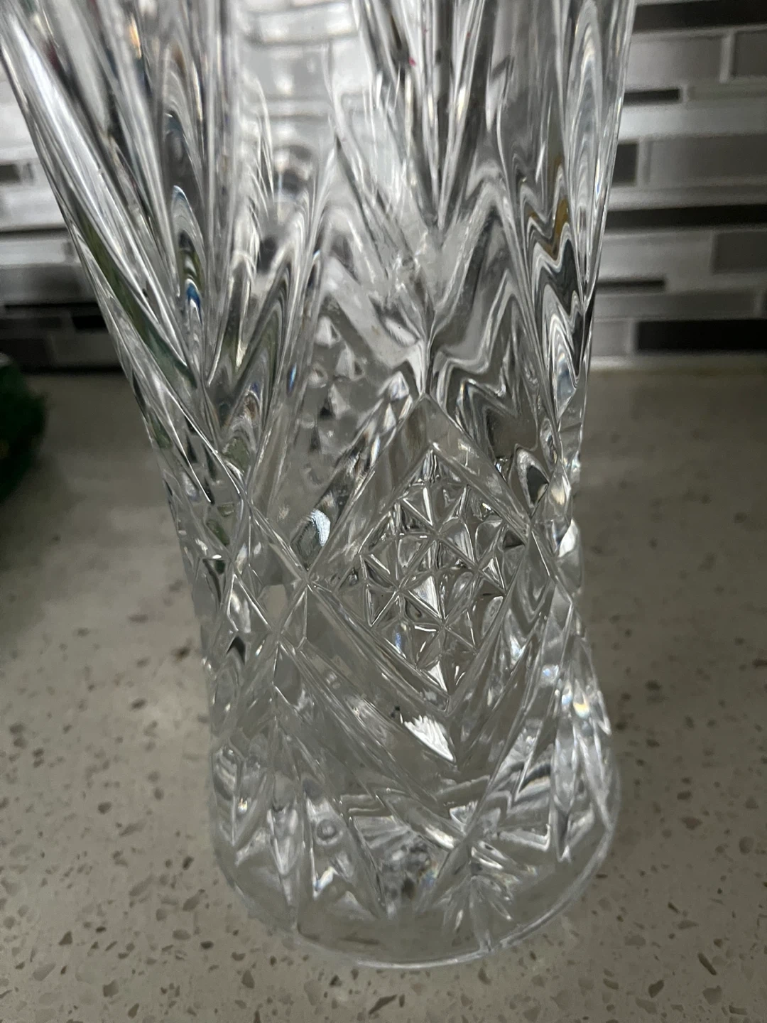 A clear glass vase with intricate cut detailing. It has a fluted top and a sturdy base. This vase is perfect for displaying bouquets of flowers.