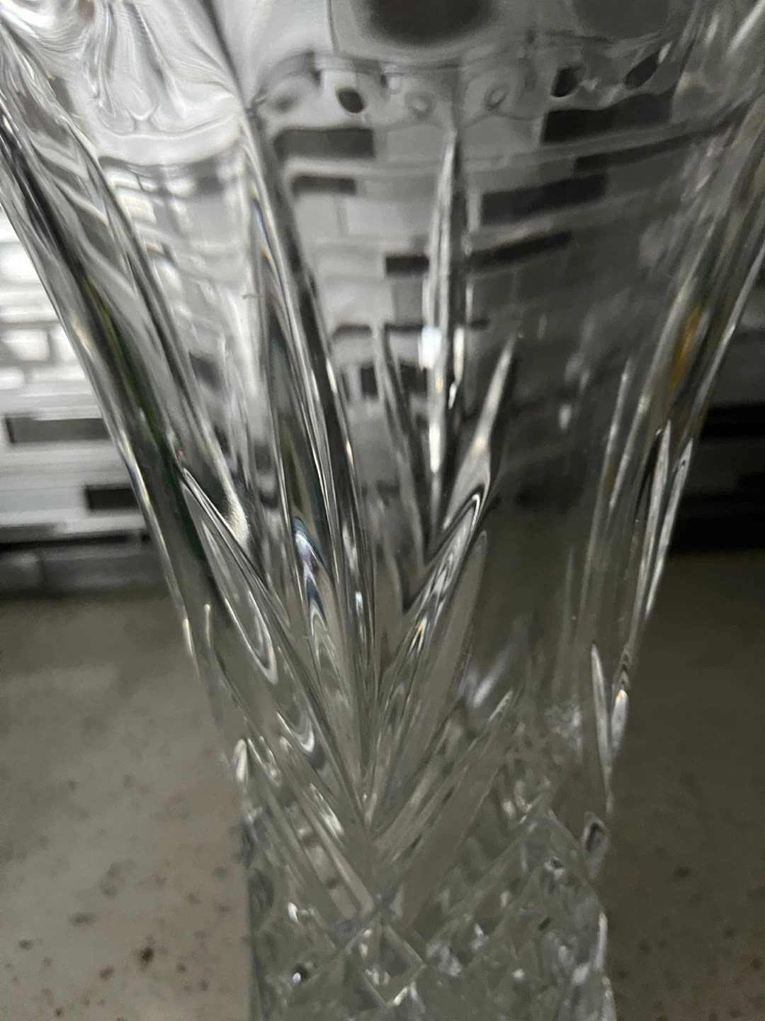 A clear glass vase with intricate cut detailing. It has a fluted top and a sturdy base. This vase is perfect for displaying bouquets of flowers.