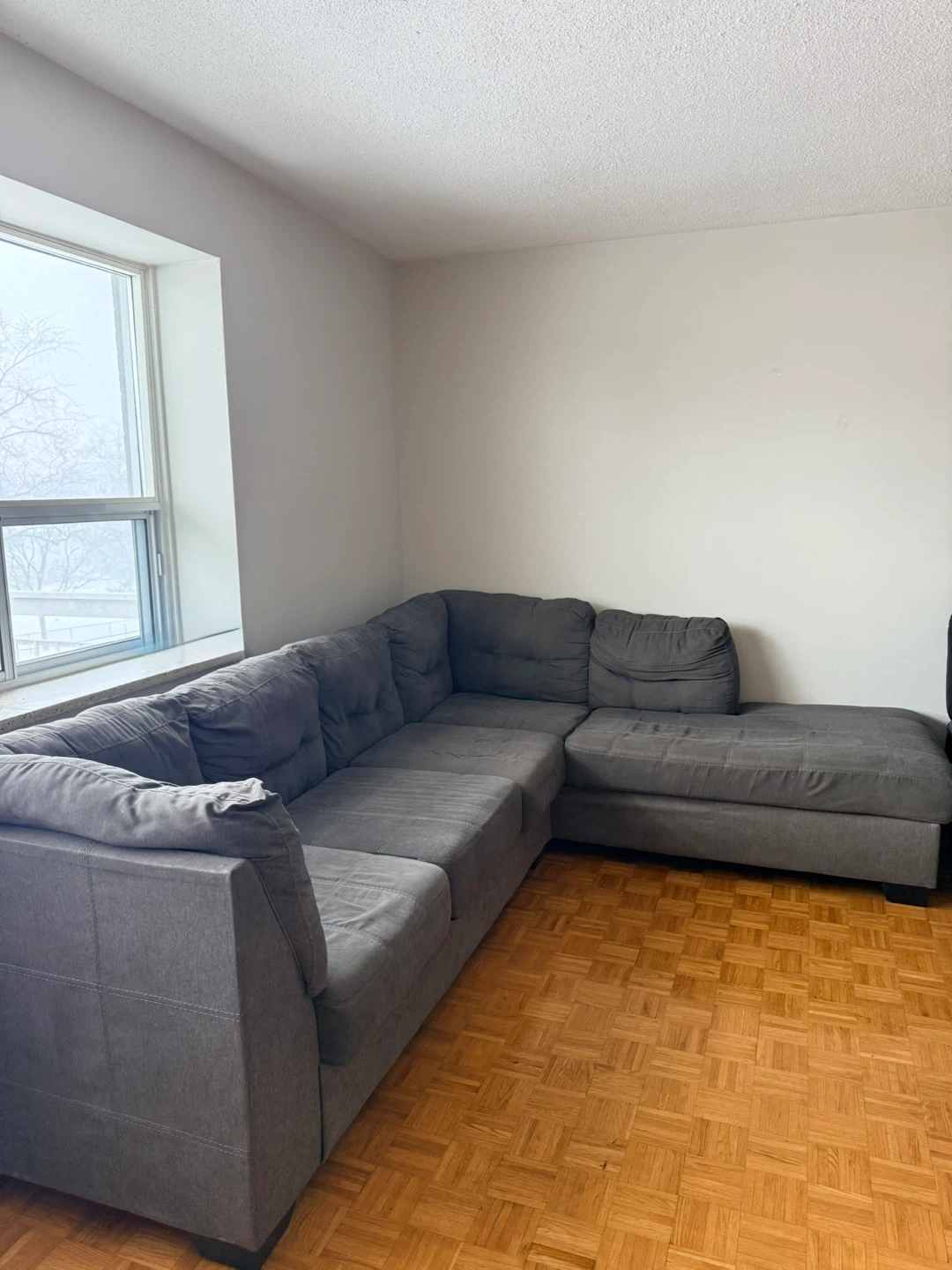 This is a grey sectional sofa with a chaise. It's made of fabric and has tufted cushions. Plenty of seating space for family and friends!