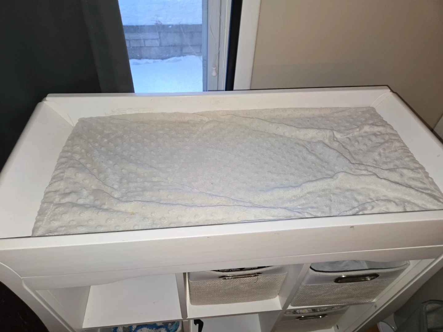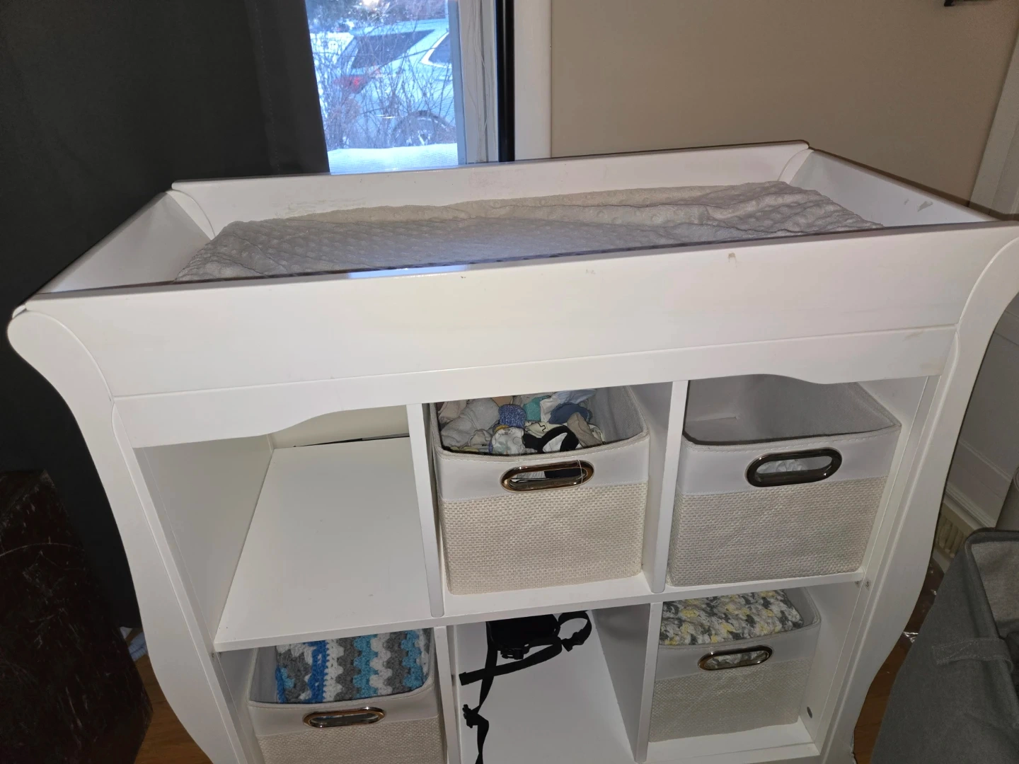 This white changing table is perfect for a nursery. It features a padded top with raised edges for safety. Below, there are cubbies with fabric bins for convenient storage of baby essentials. The table includes the bins.