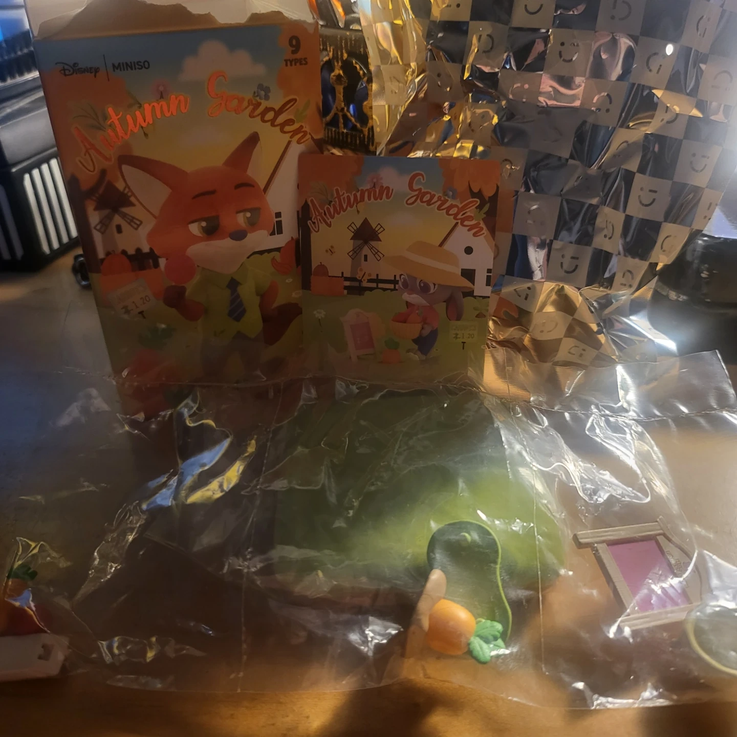 This is a MINISO "Autumn Garden" blind box collection featuring Disney characters. It includes small collectible figurines and accessories like carrots, tomatoes, and mini scenes. Collect all nine types!