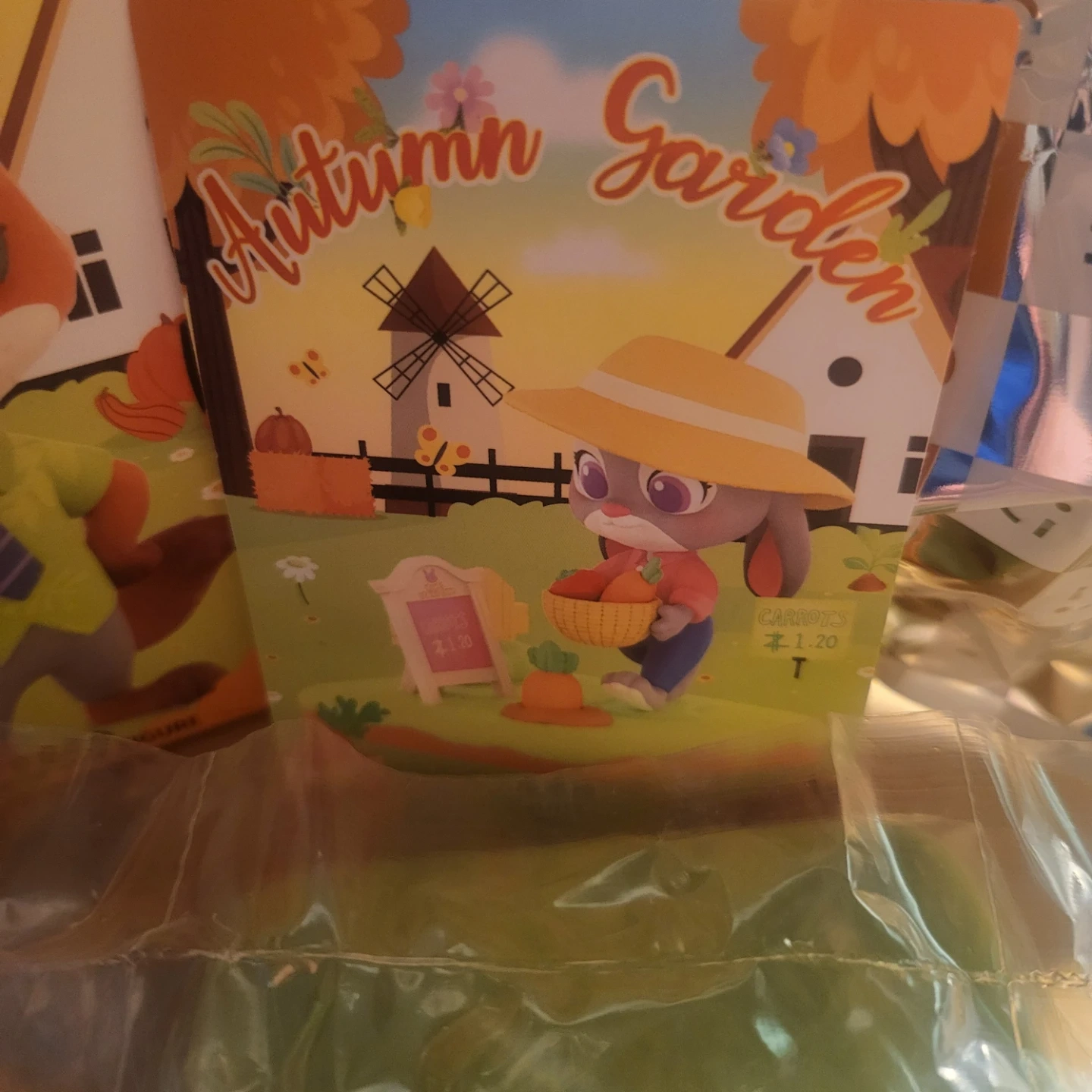 This is a MINISO "Autumn Garden" blind box collection featuring Disney characters. It includes small collectible figurines and accessories like carrots, tomatoes, and mini scenes. Collect all nine types!