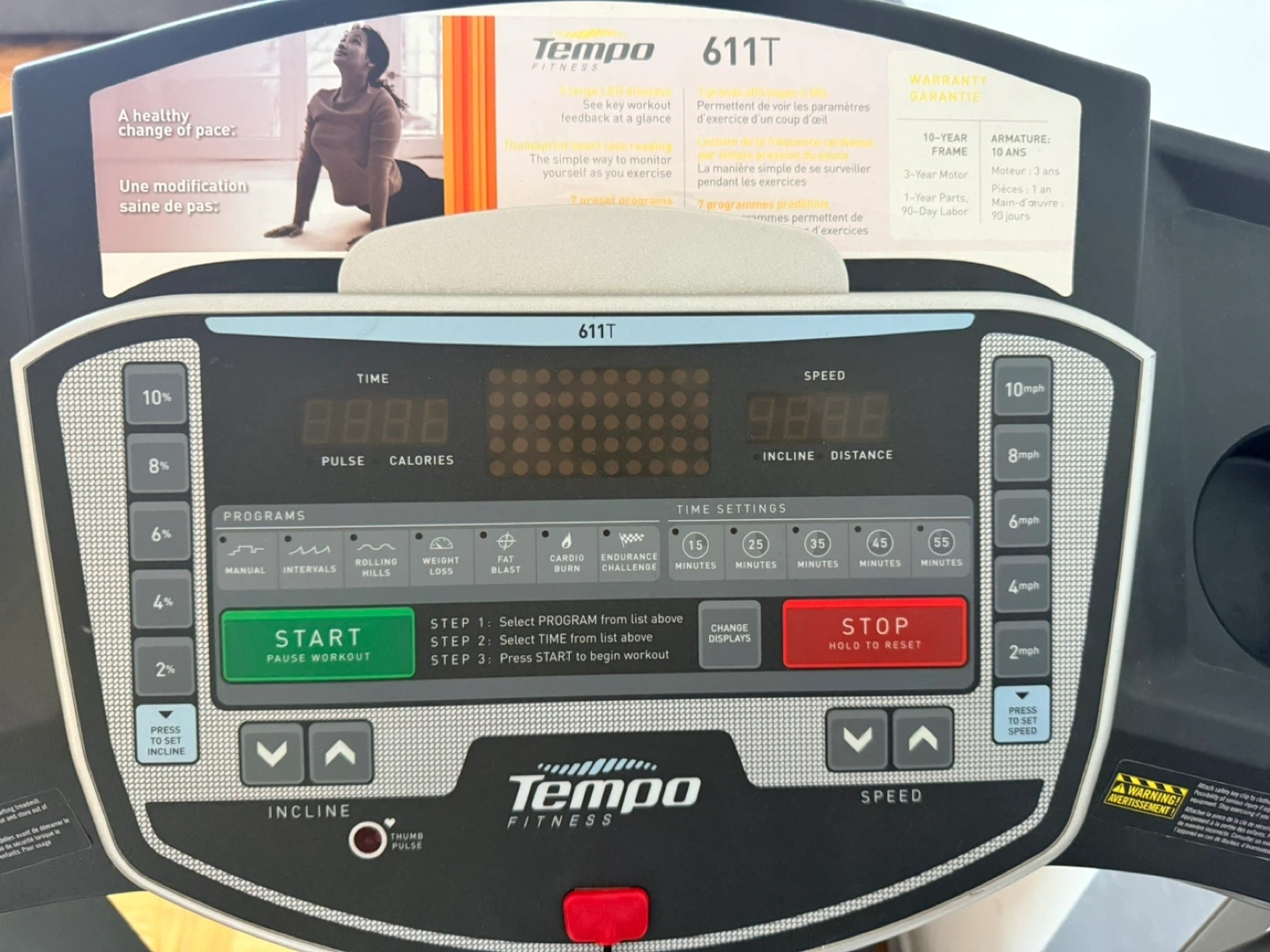 Tempo Fitness 611T treadmill with multiple programs and speed settings. It has incline and pulse monitoring for a great workout. This treadmill is suitable for home fitness.
