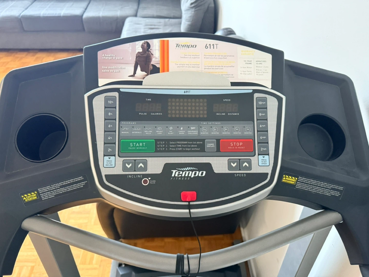 Tempo Fitness 611T treadmill with multiple programs and speed settings. It has incline and pulse monitoring for a great workout. This treadmill is suitable for home fitness.