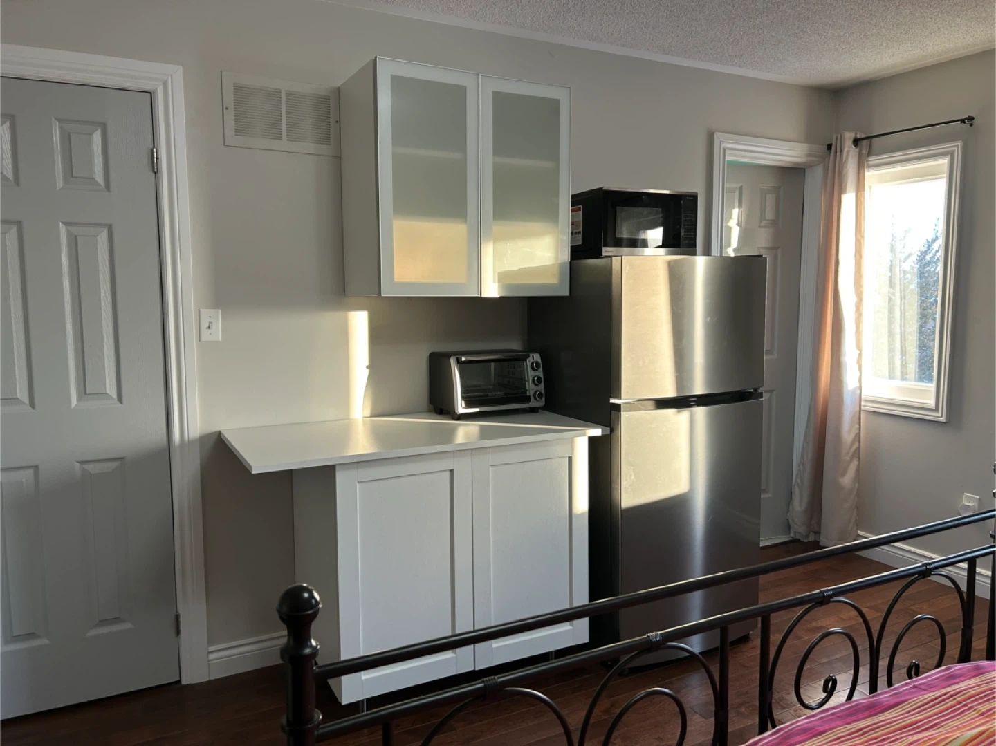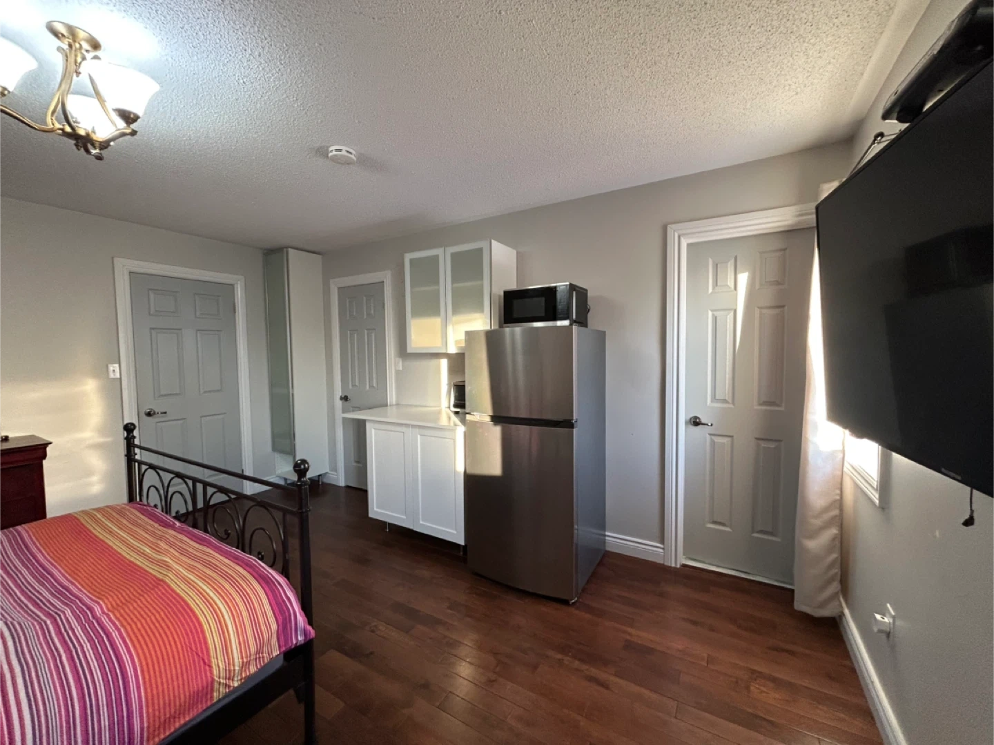 This is a large, fully furnished room with a private ensuite bathroom and a walk in closet. Inside the room there is a kitchenette with a microwave and toaster oven, as well as a private fridge. The space is bright with multiple windows and excellent natural light. Furnishings include a queen size bed, desk, dresser, and TV.