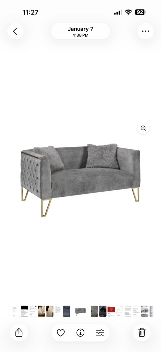 Grey Velvet Loveseat with Tufted Back and Gold Legs