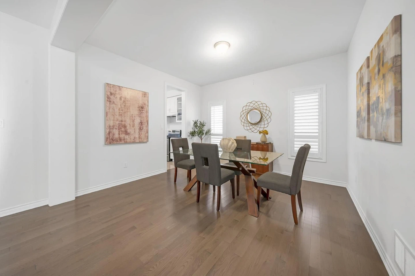 A stylish glass-top dining table with a unique wooden base. It comes with four matching upholstered chairs. This set's modern design complements most dining spaces. It's perfect for family meals and entertaining guests!