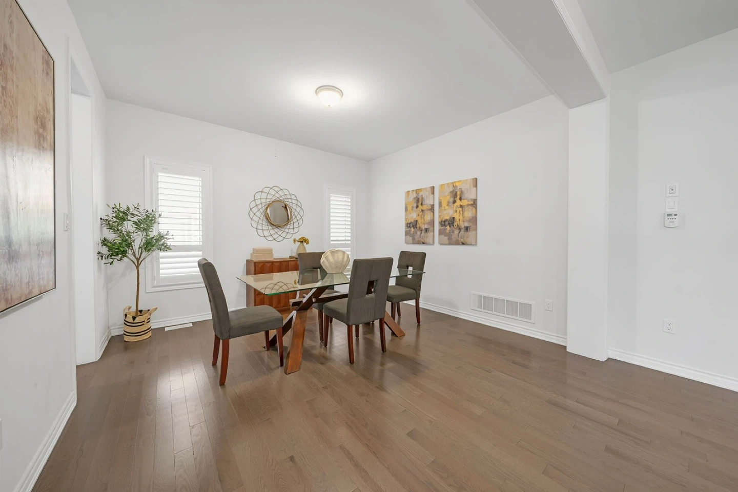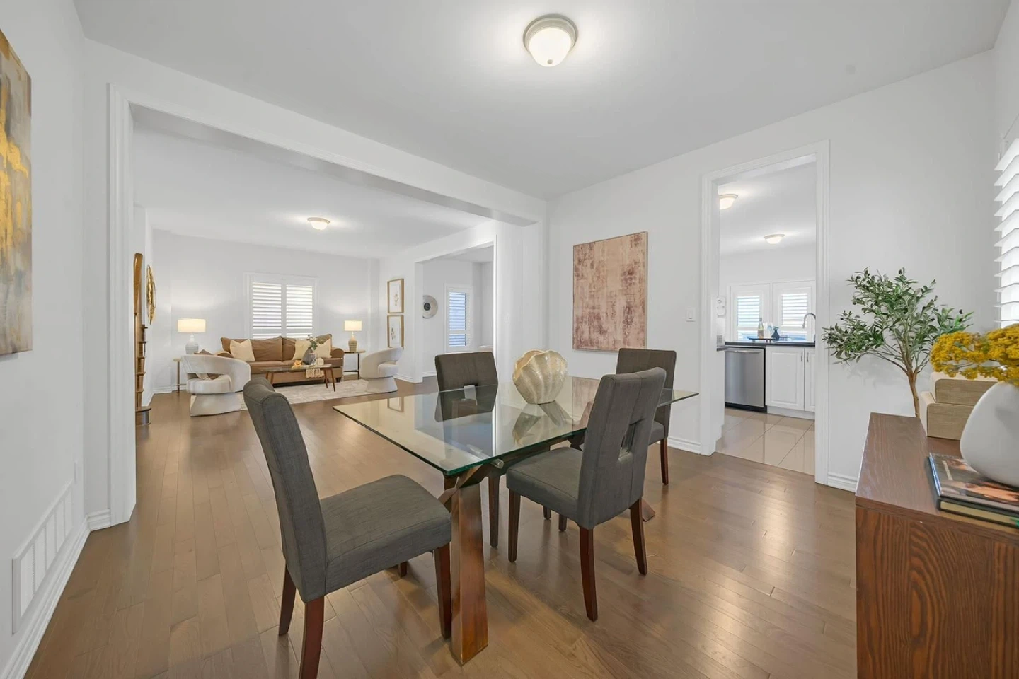 A stylish glass-top dining table with a unique wooden base. It comes with four matching upholstered chairs. This set's modern design complements most dining spaces. It's perfect for family meals and entertaining guests!