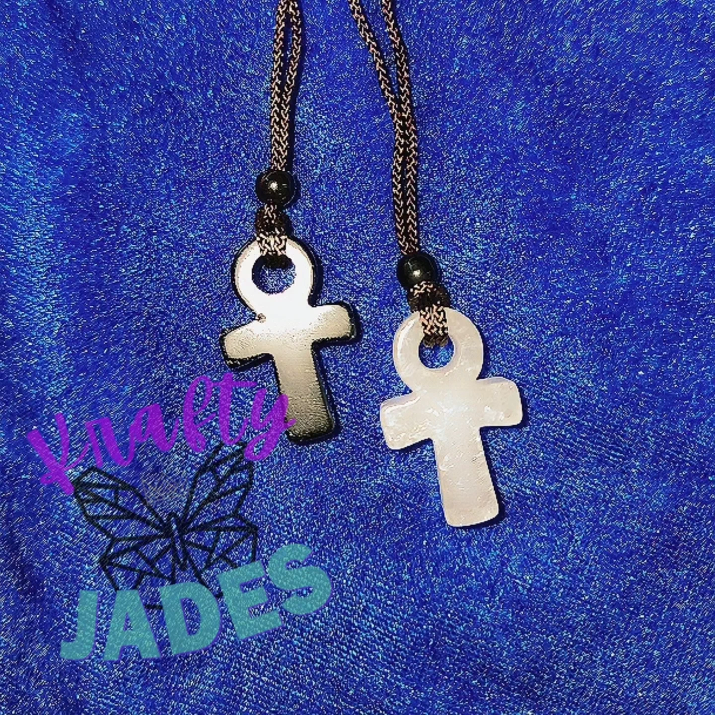 Necklaces, each featuring an ankh pendant made of obsidian and quartz crystal. They hang on braided cords with a small black bead accent. Perfect for anyone interested in ancient Egyptian symbolism or unique jewellery pieces!